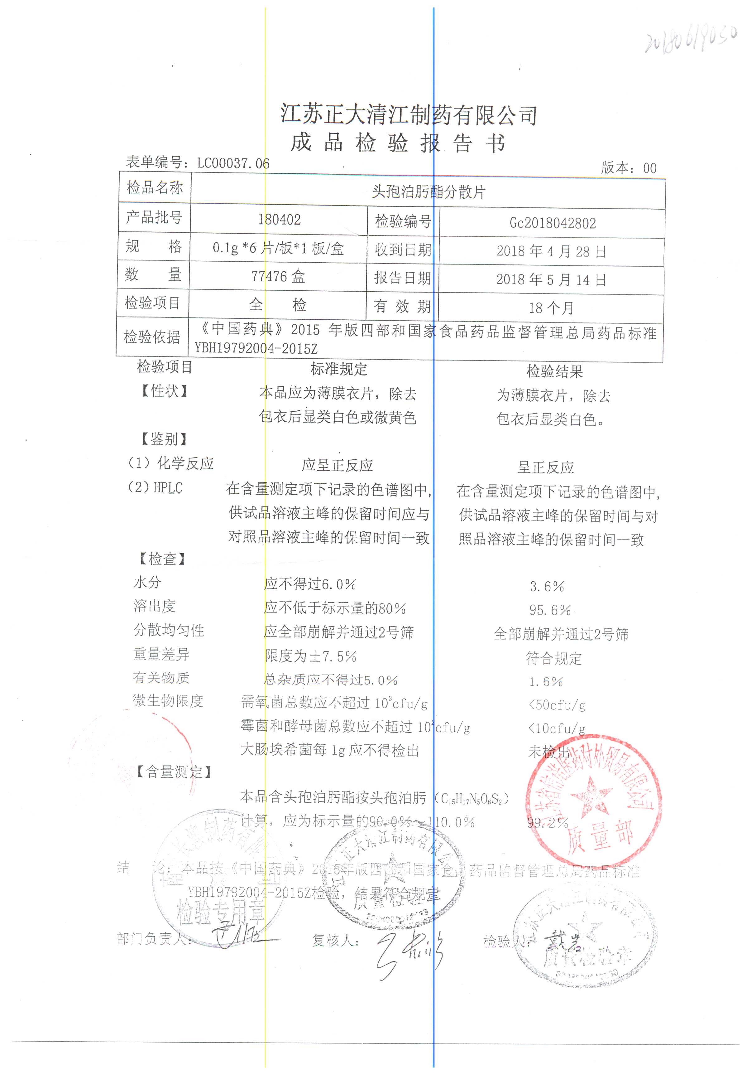 | 頭孢泊肟酯分散片 | 0.1g*6s | 180402 | 查看詳情 |