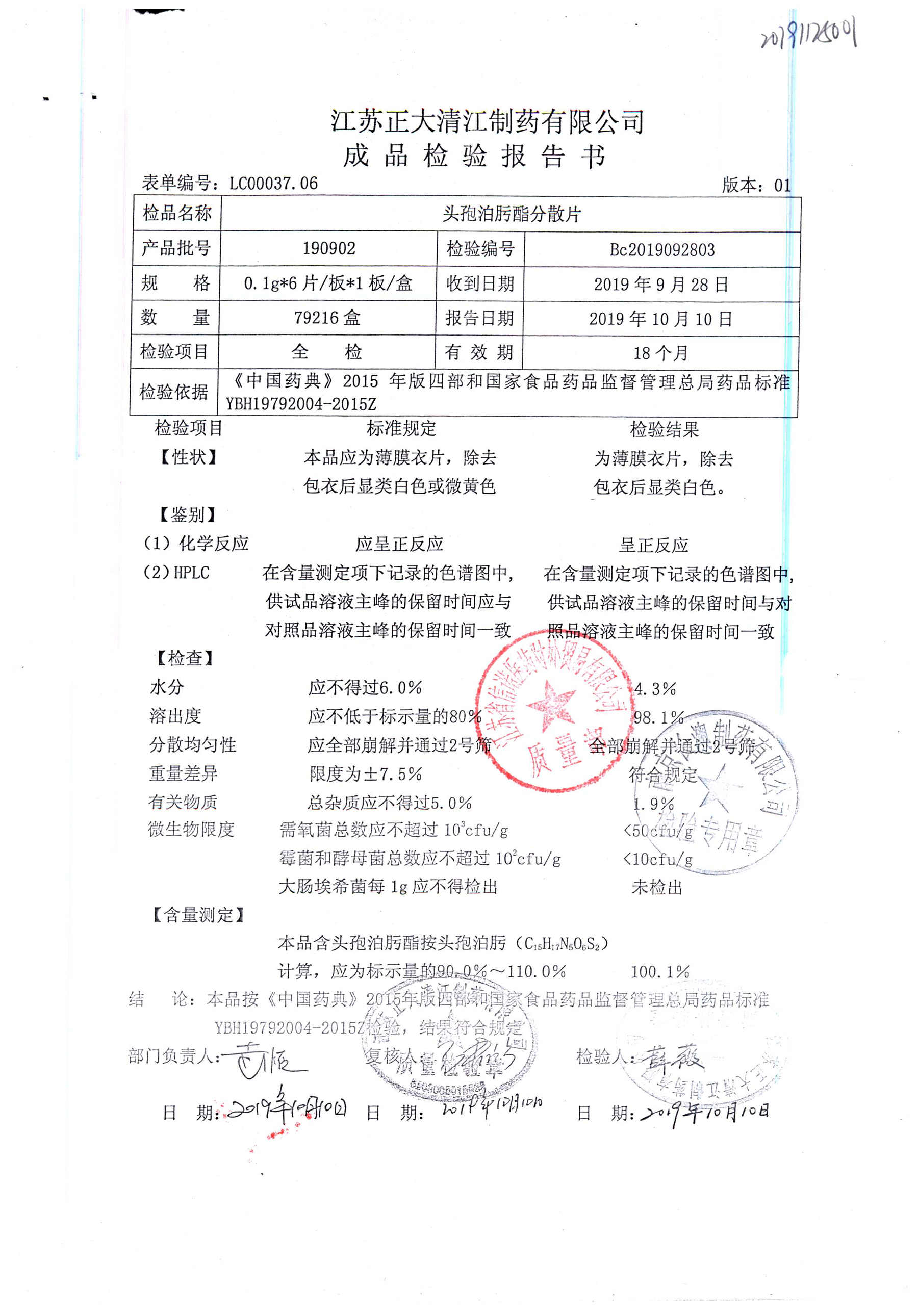 | 頭孢泊肟酯分散片 | 0.1g*6s | 190803 | 查看詳情 |