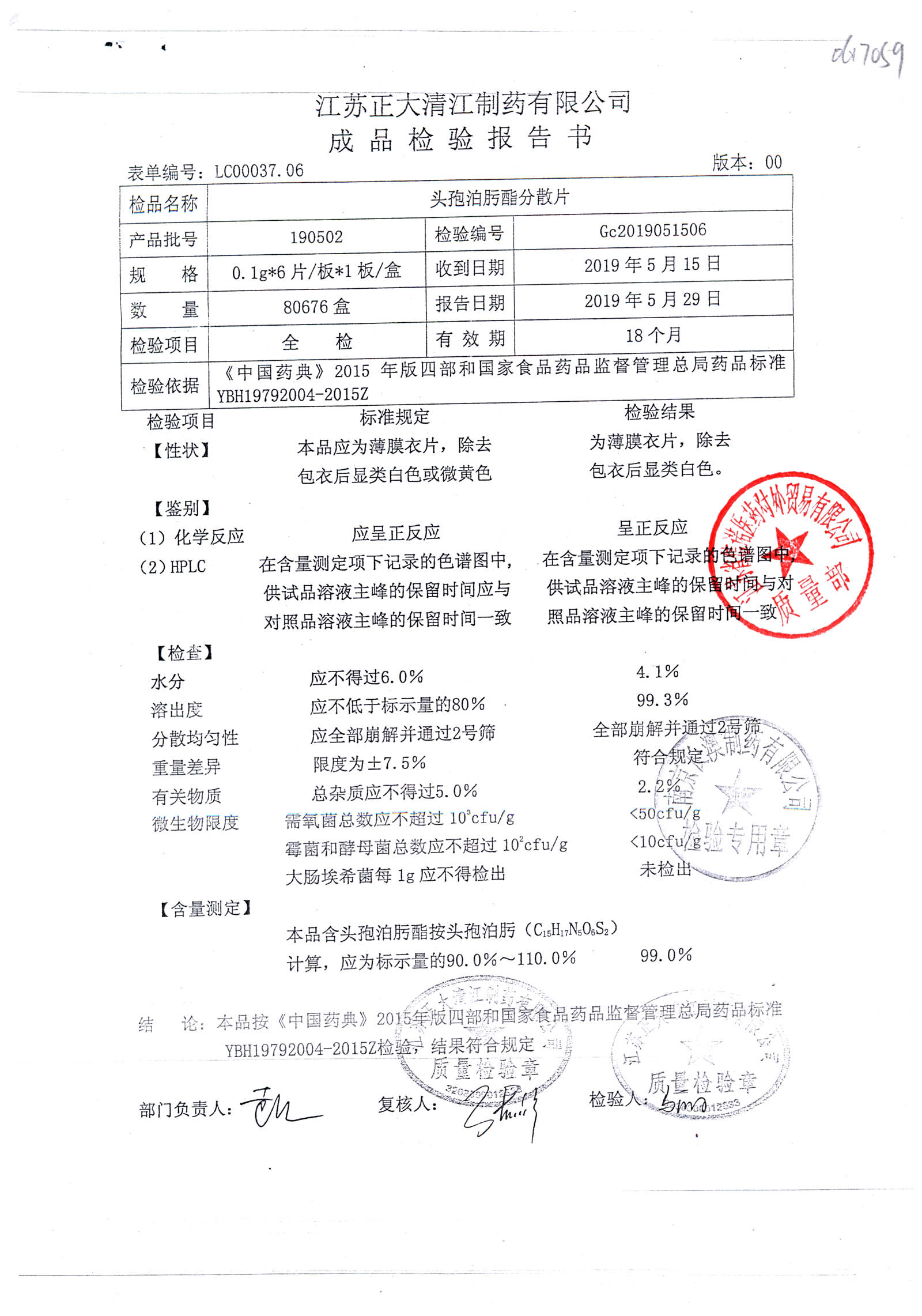 | 頭孢泊肟酯分散片 | 0.1g*6s | 180502 | 查看詳情 |