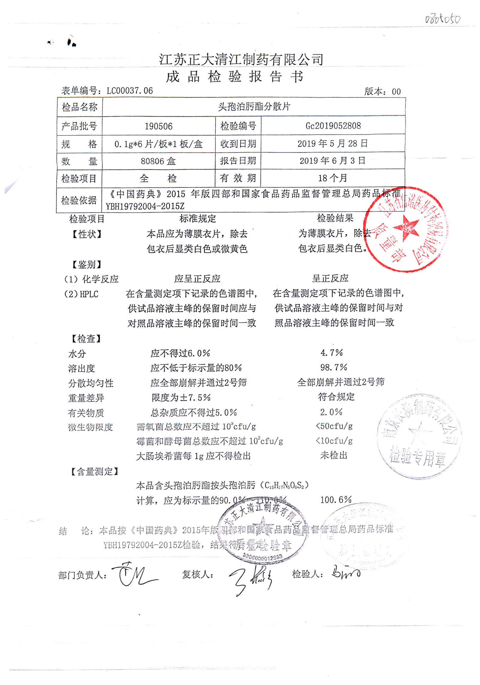 | 頭孢泊肟酯分散片 | 0.1g*6s | 190506 | 查看詳情 |