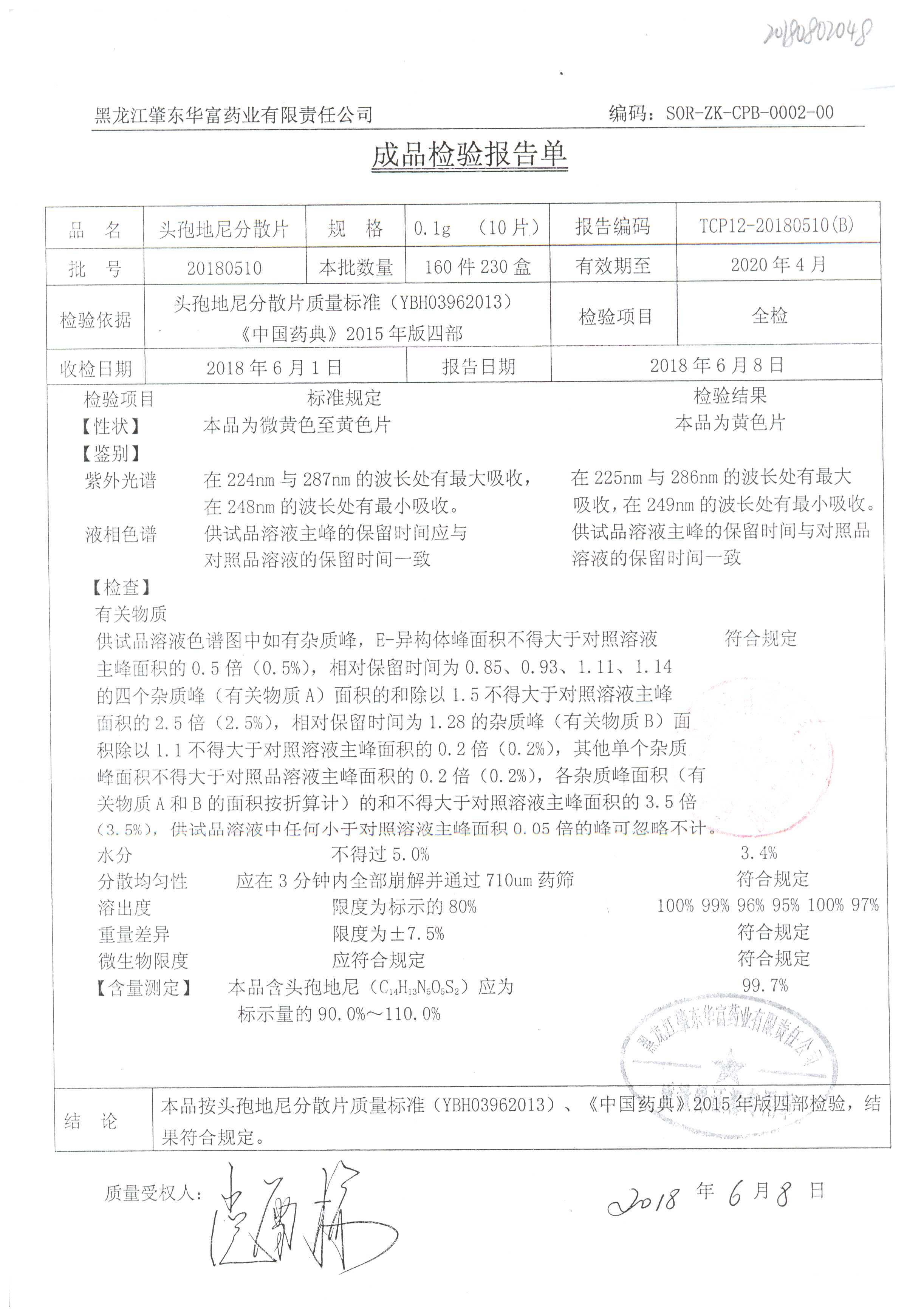 | 頭孢地尼分散片 | 0.1g*10s | 20180510 | 查看詳情 |