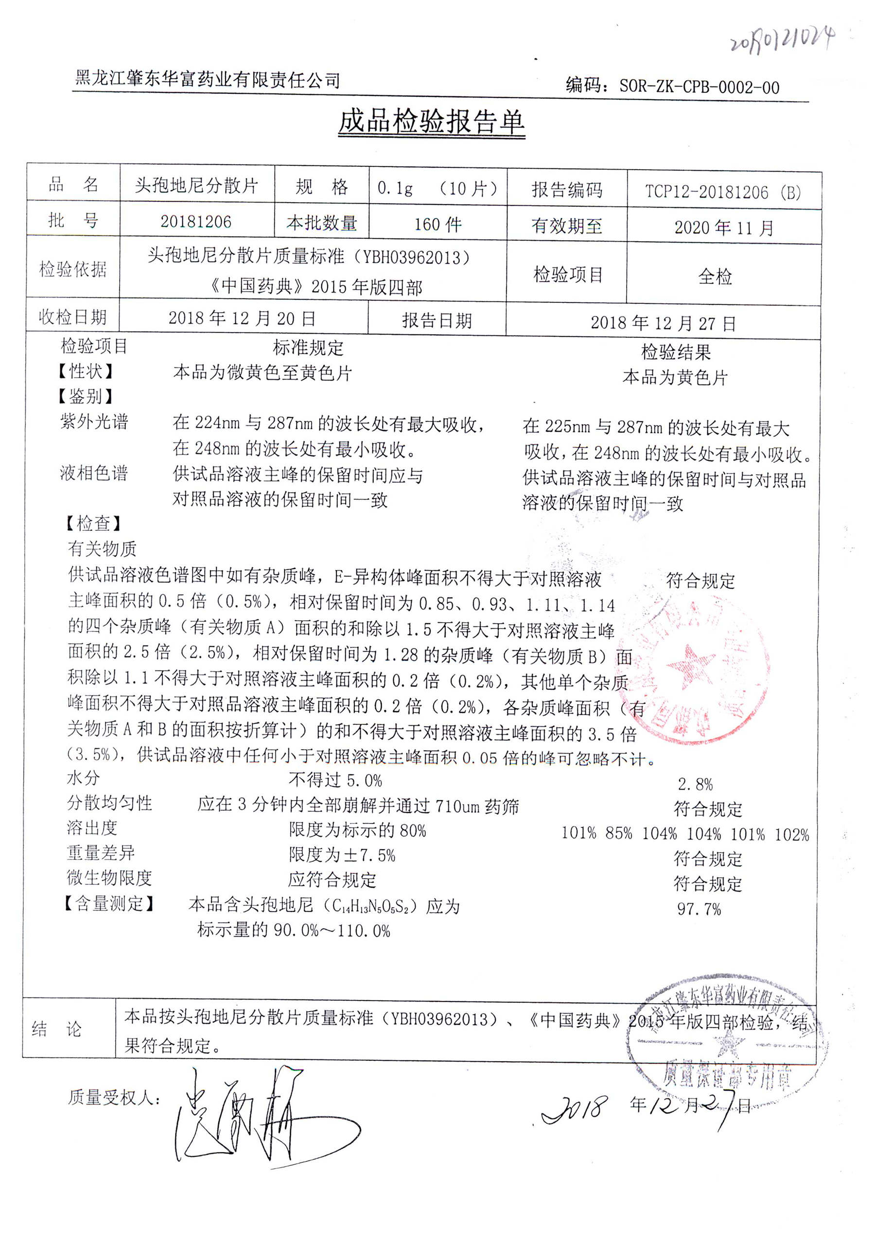 | 頭孢地尼分散片 | 0.1g*10s | 20181206 | 查看詳情 |