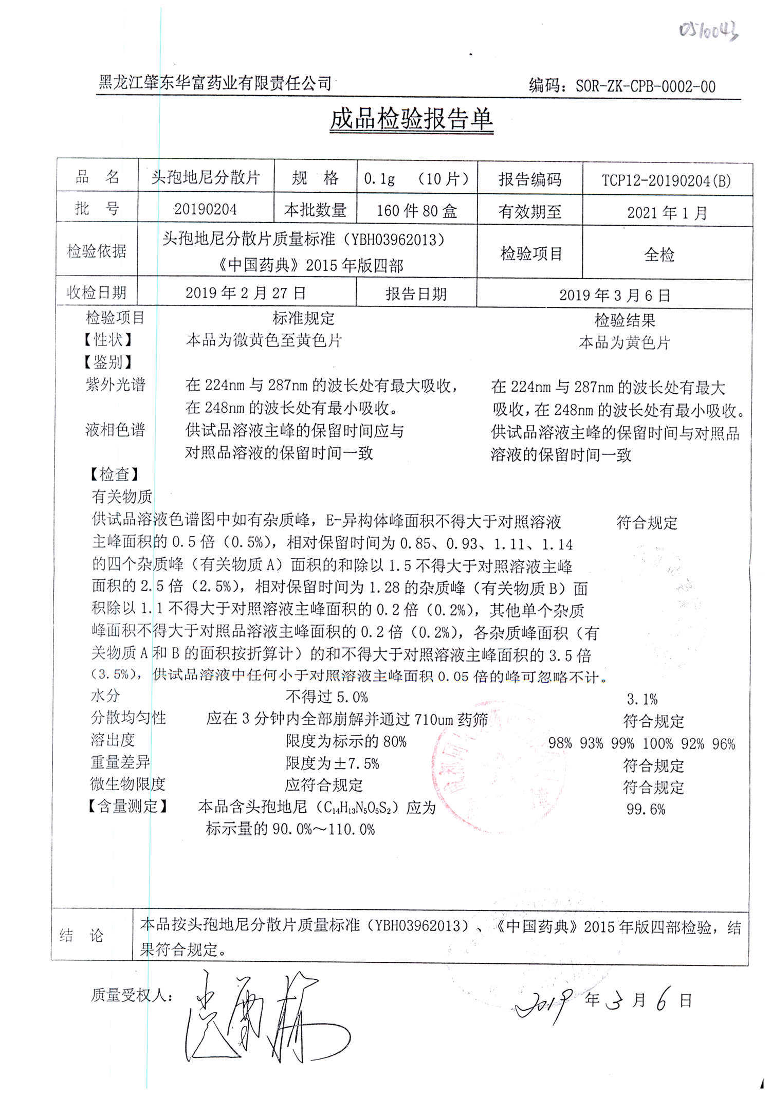 | 頭孢地尼分散片 | 0.1g*10s | 20190204 | 查看詳情 |