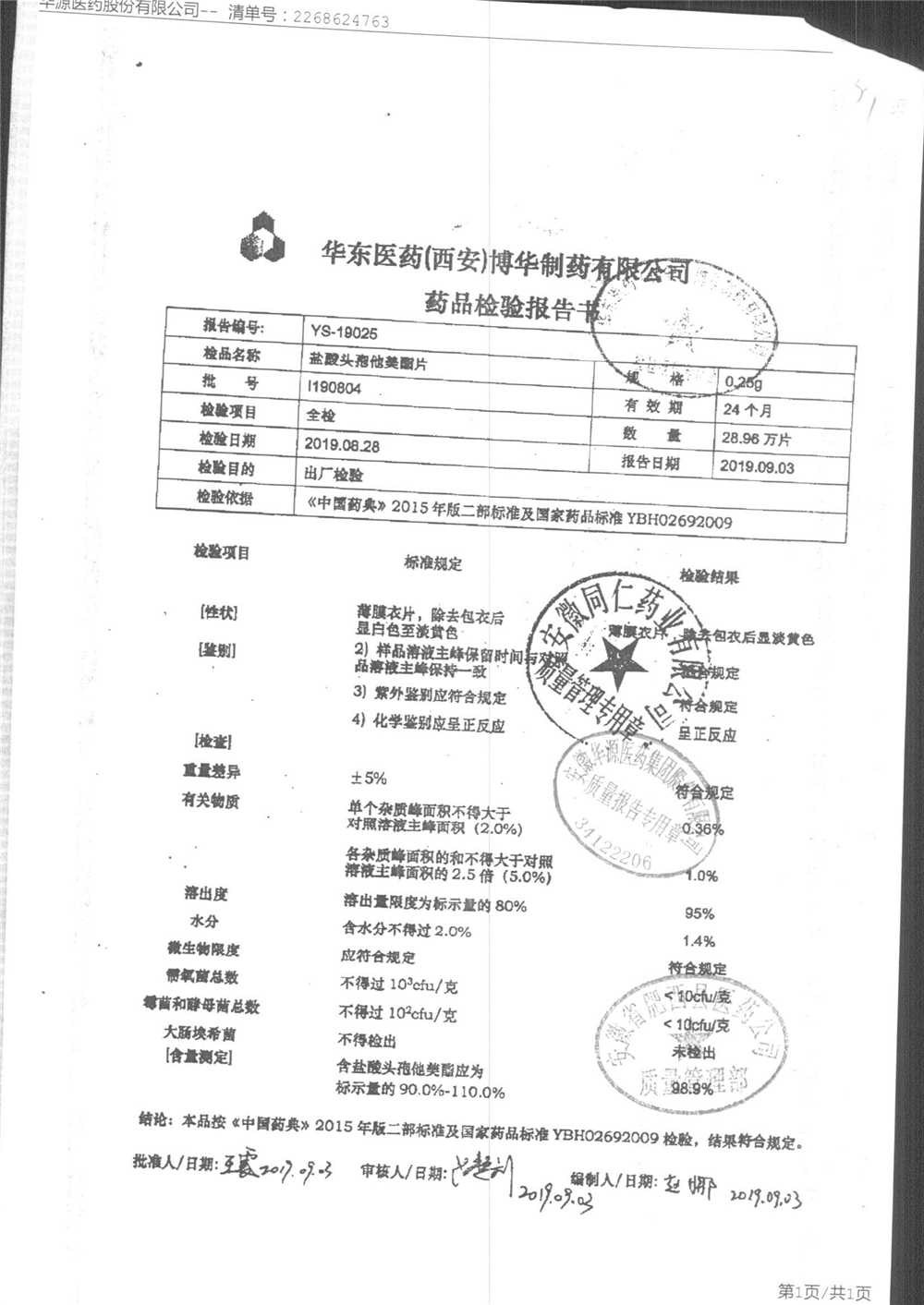 | 鹽酸頭孢他美酯片 | 0.25g | I190601 | 查看詳情 |