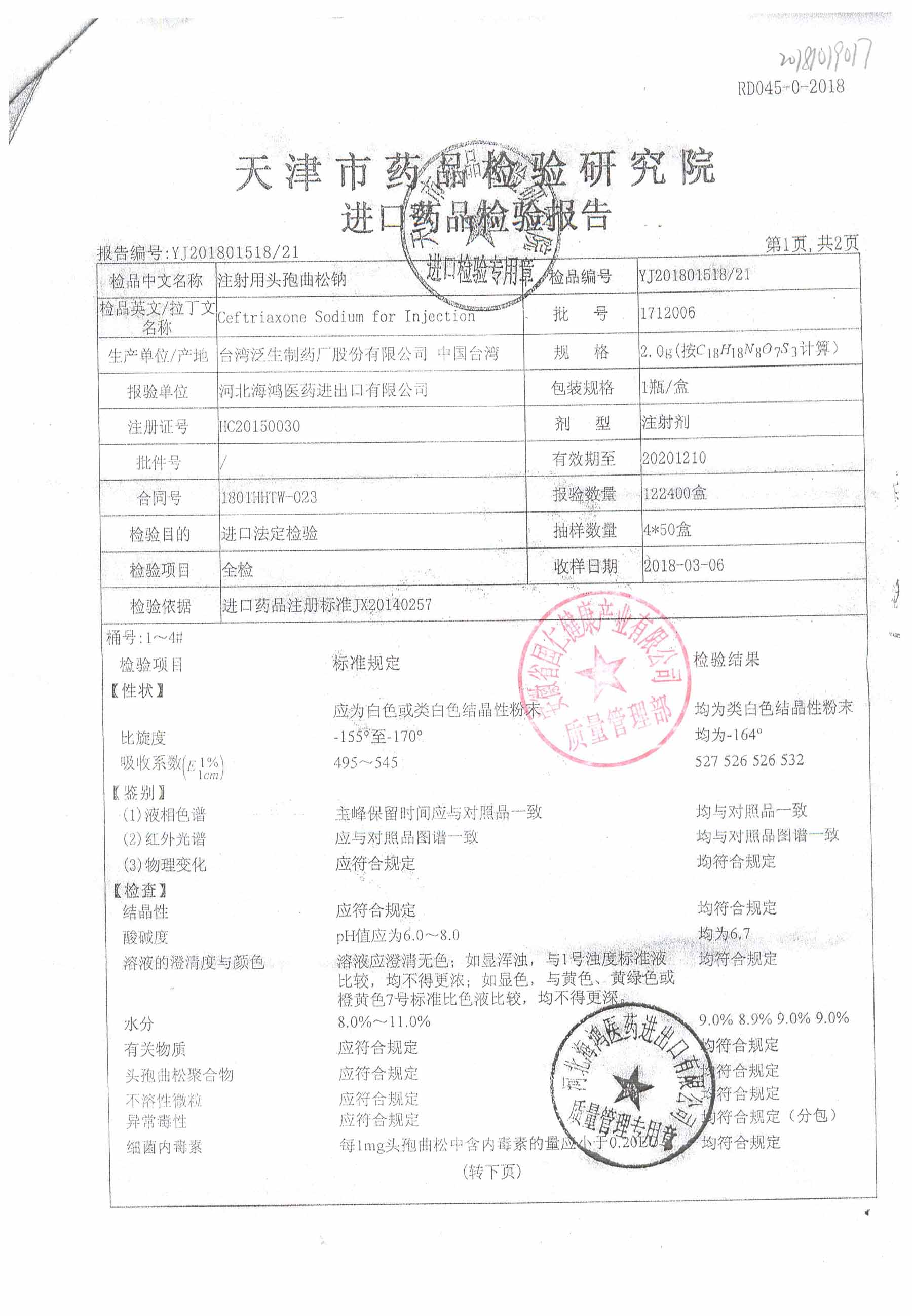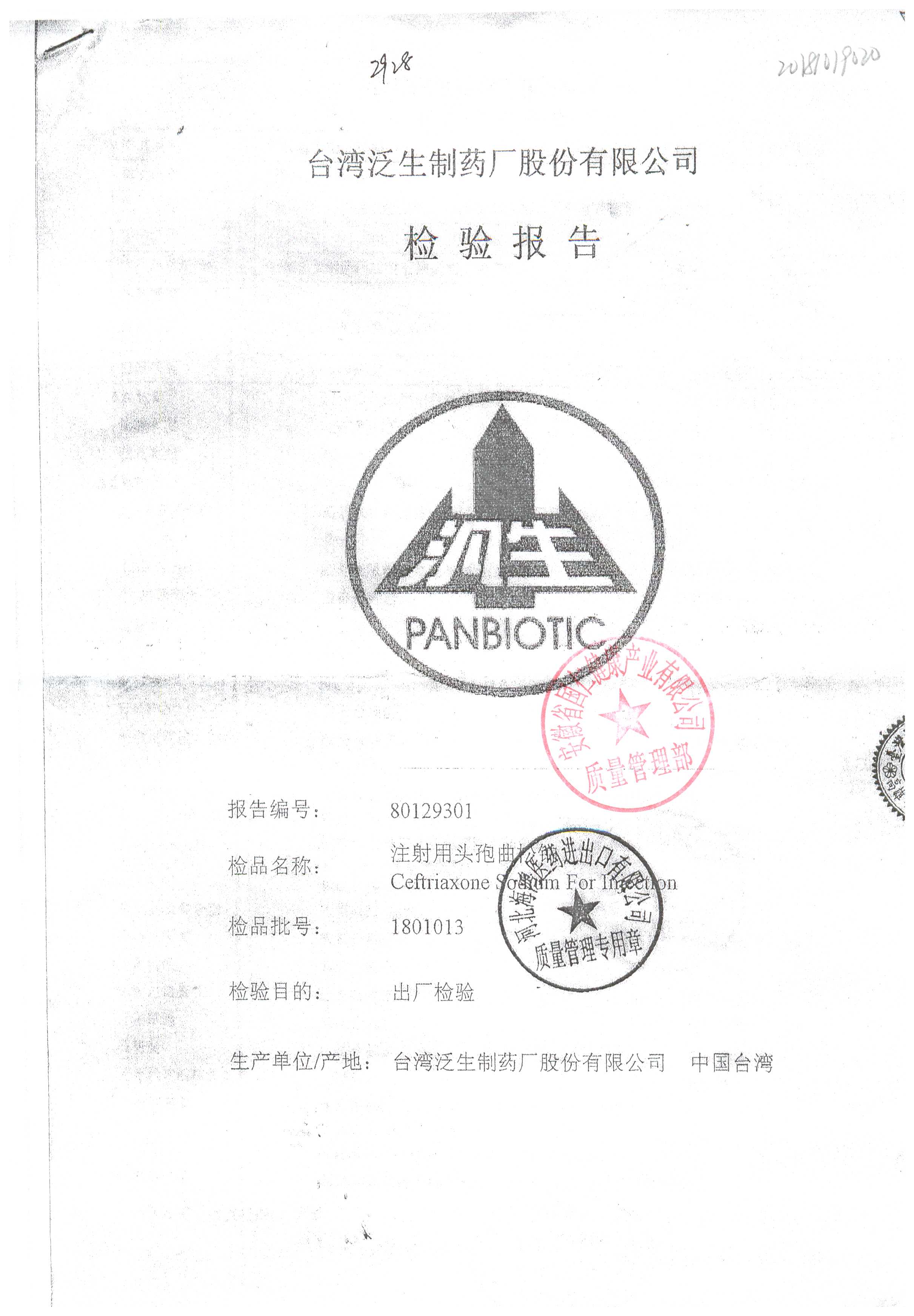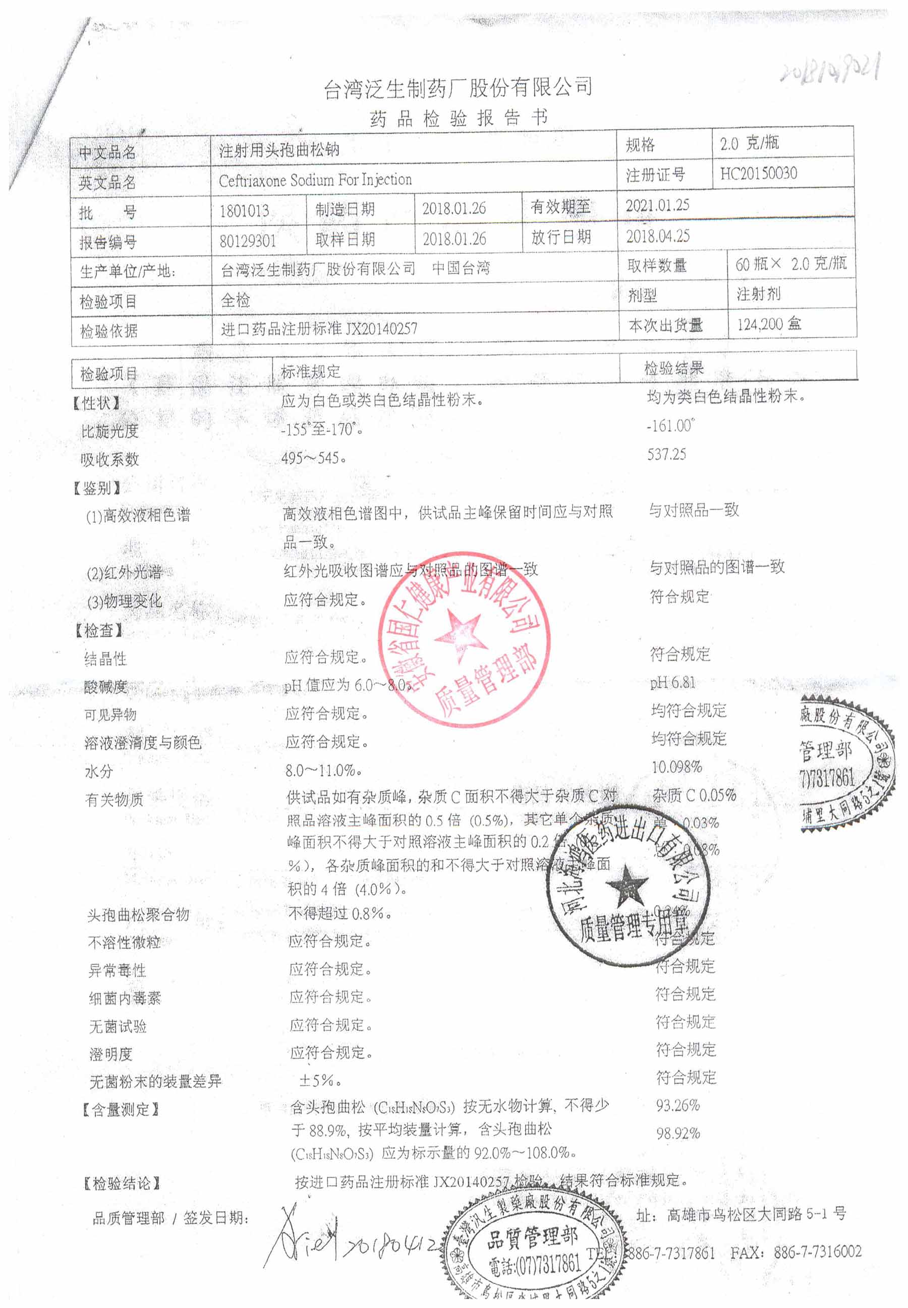 | 注射用頭孢曲松鈉 | 2.0g | 1801013(1/3) | 查看詳情 |