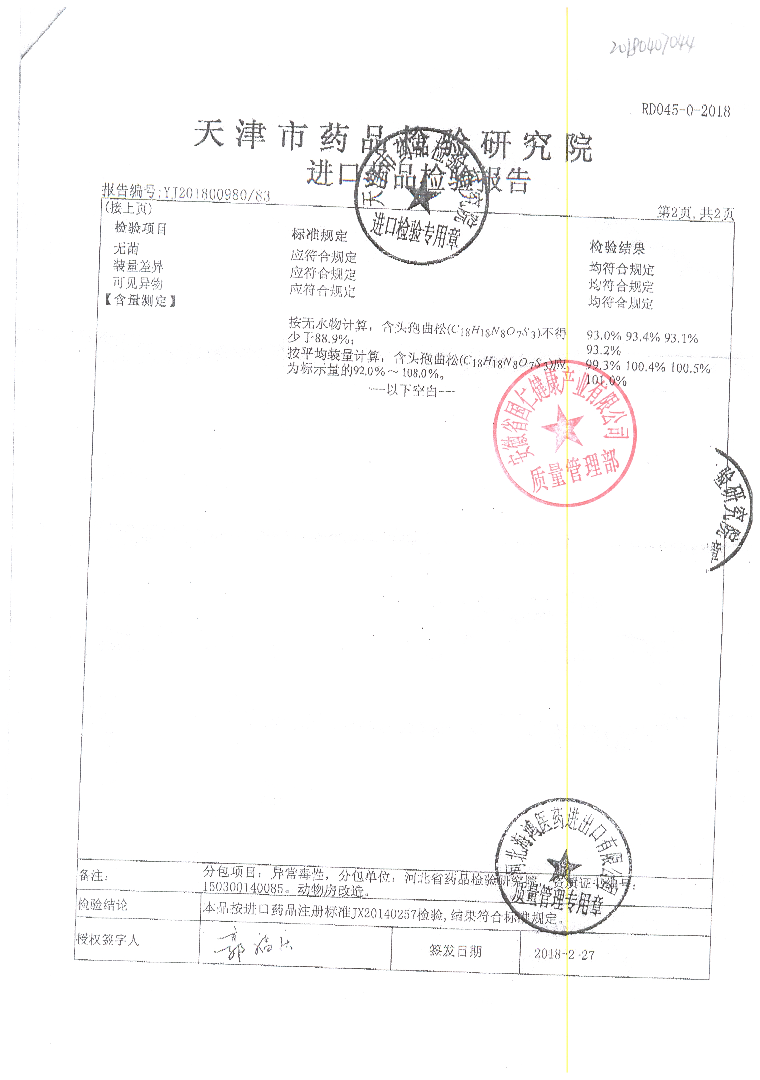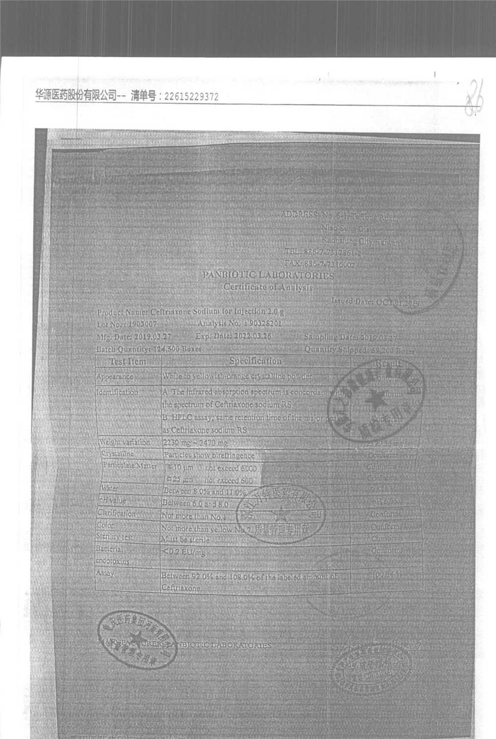 | 注射用頭孢曲松鈉 | 2.0g | 1903007(4/5) | 查看詳情 |