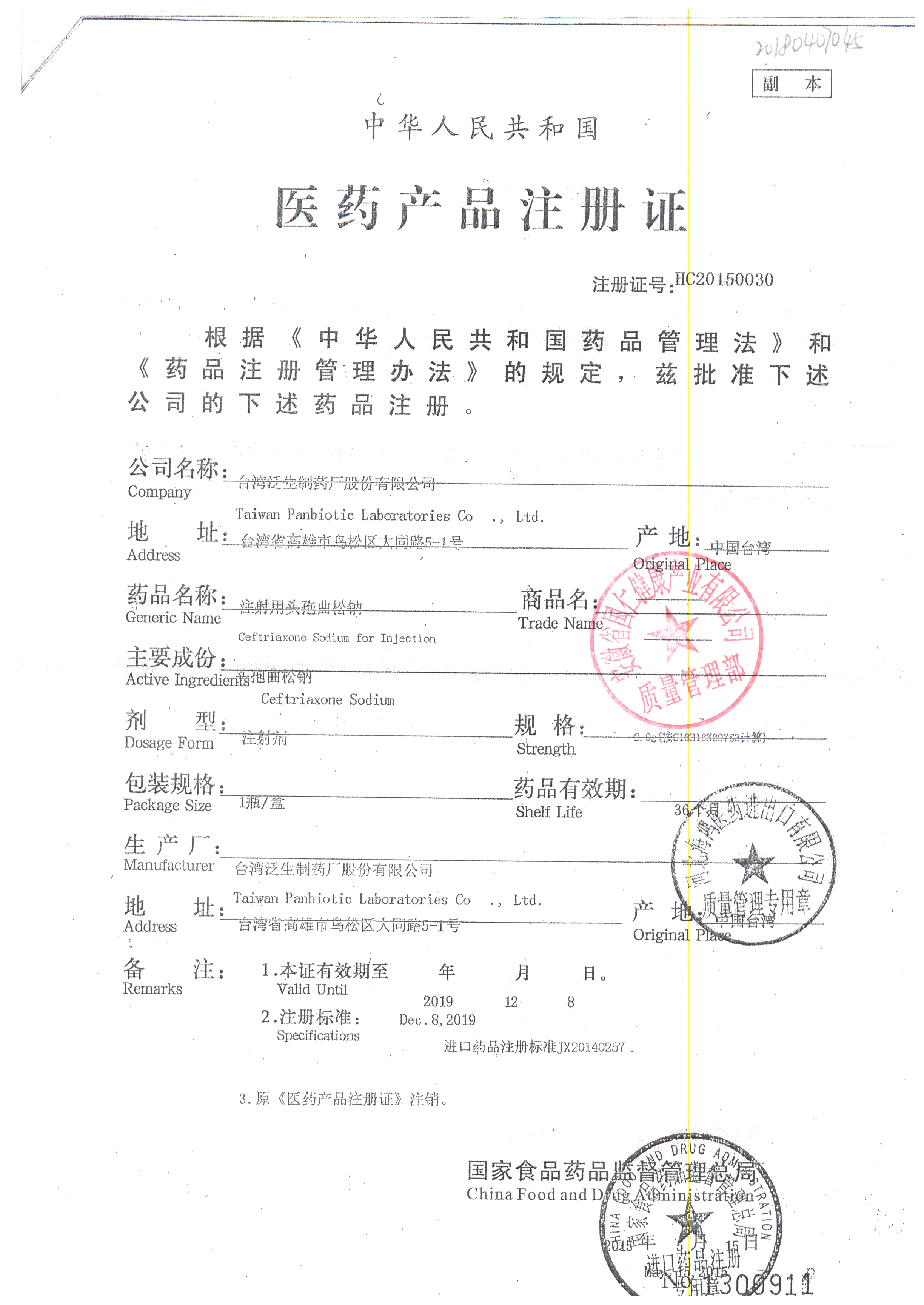 | 注射用頭孢曲松鈉 | 2.0g | 2004003(4/4) | 查看詳情 |