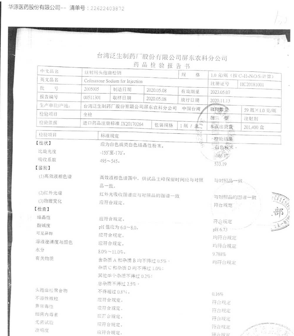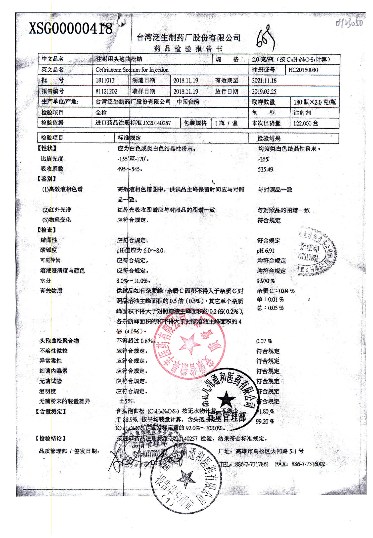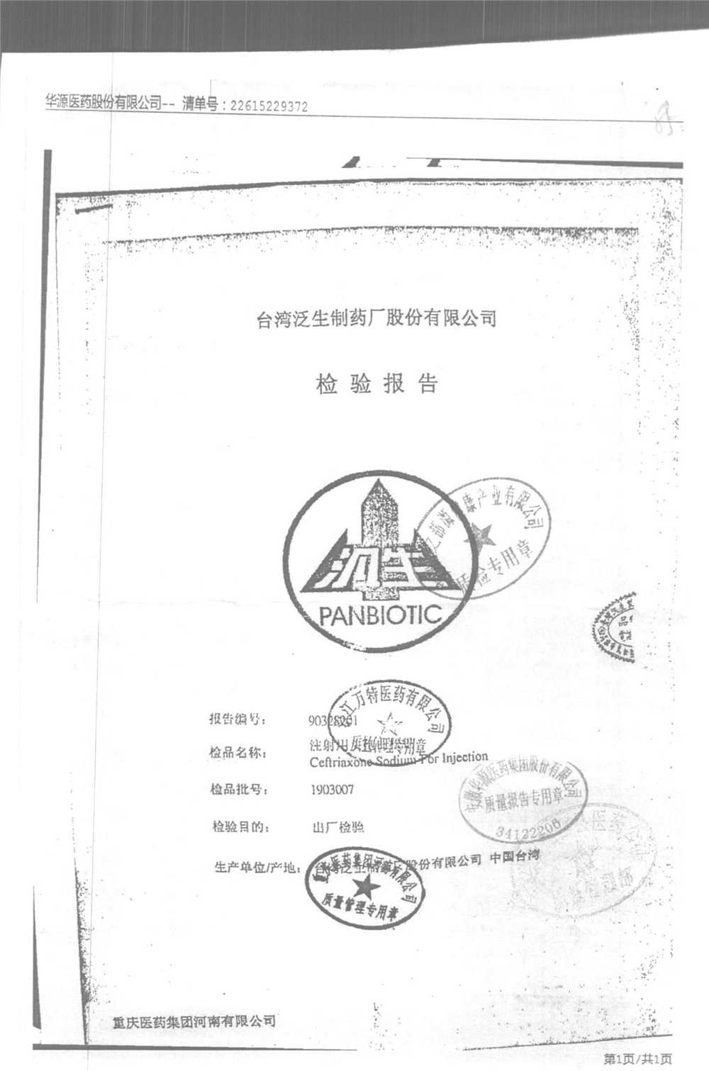 | 注射用頭孢曲松鈉 | 2.0g | 1903007(5/5) | 查看詳情 |