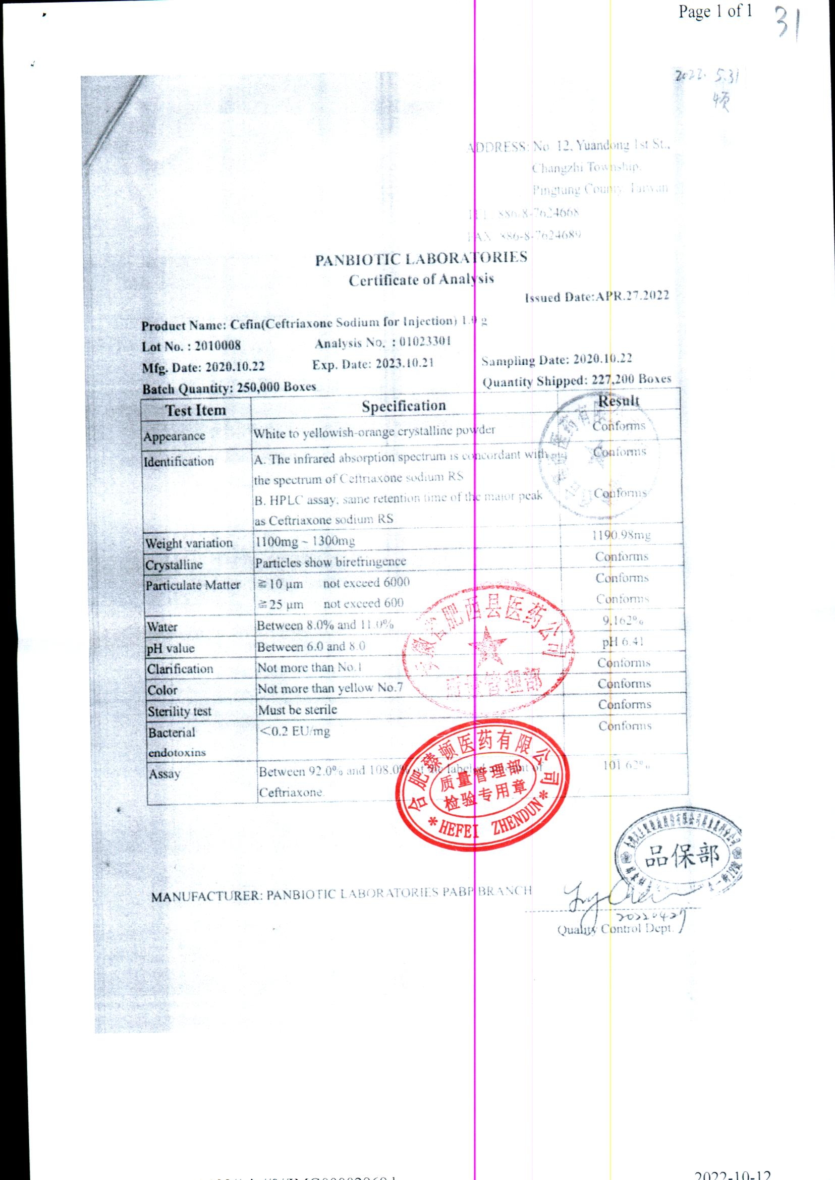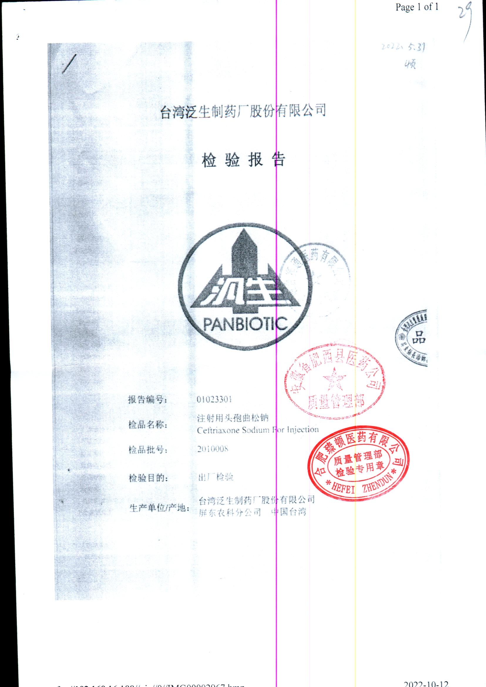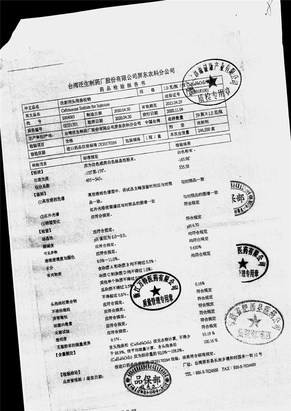 | 注射用頭孢曲松鈉 | 2.0g | 1903007(5/5) | 查看詳情 |
