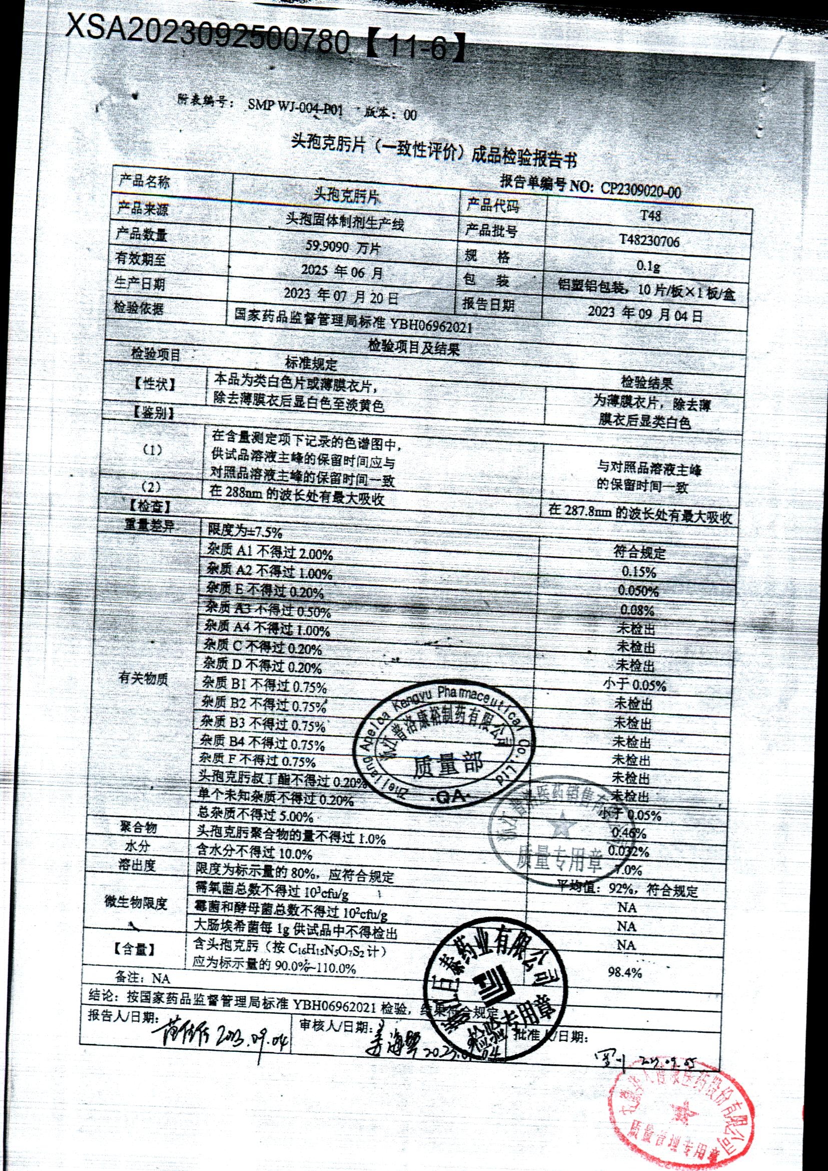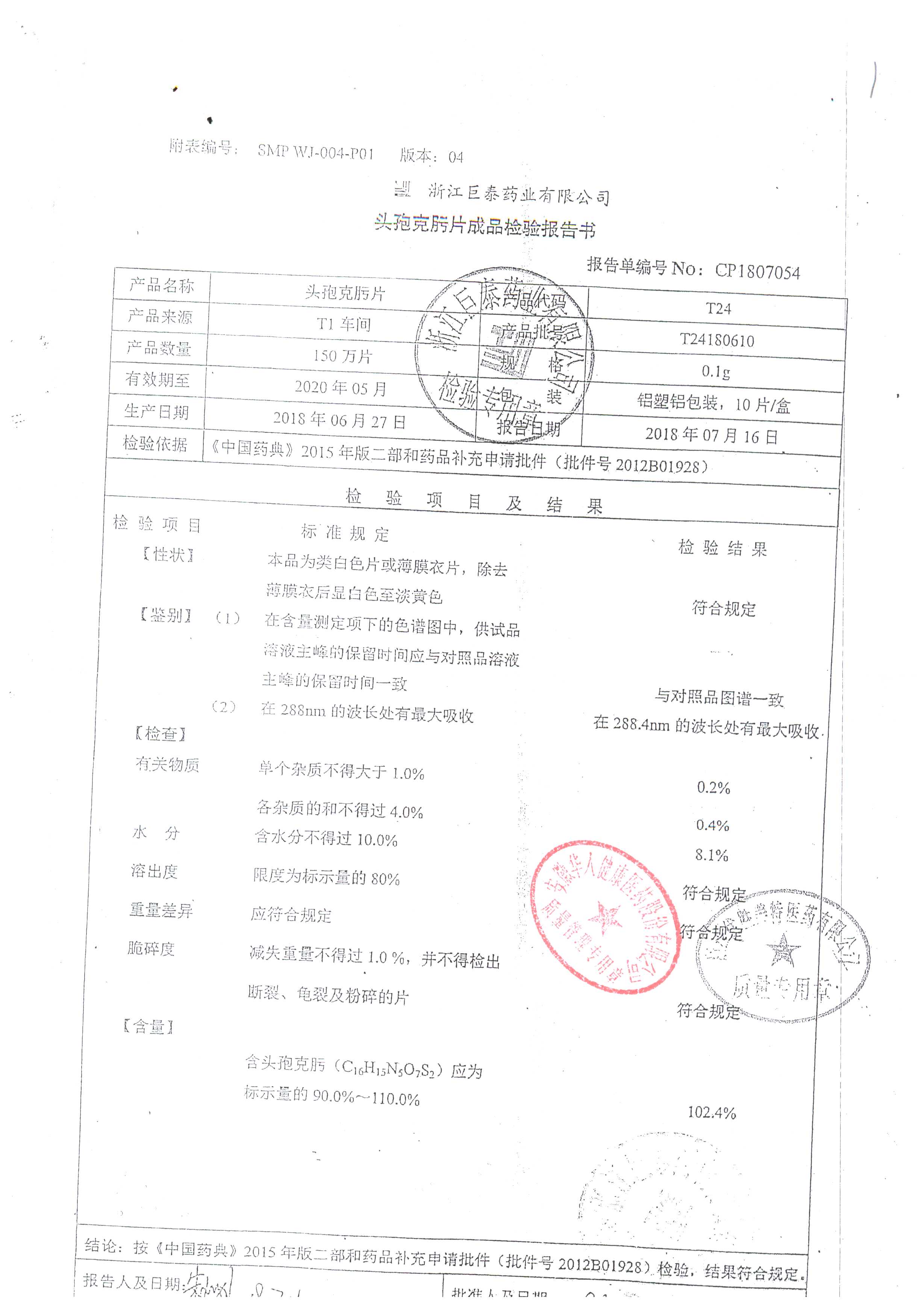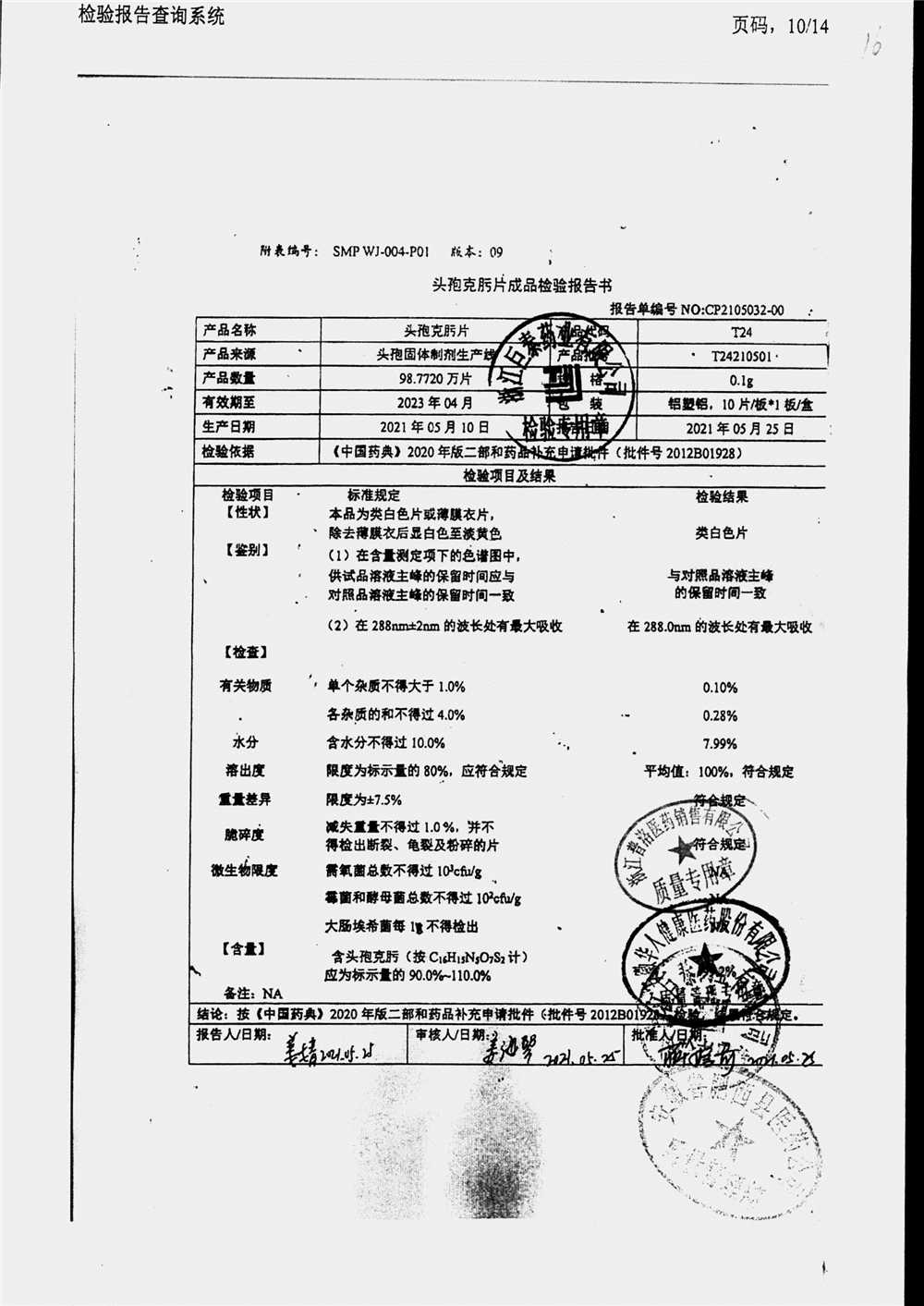 | 頭孢克肟片 | 0.1g*10s | T24210501 | 查看詳情 |
