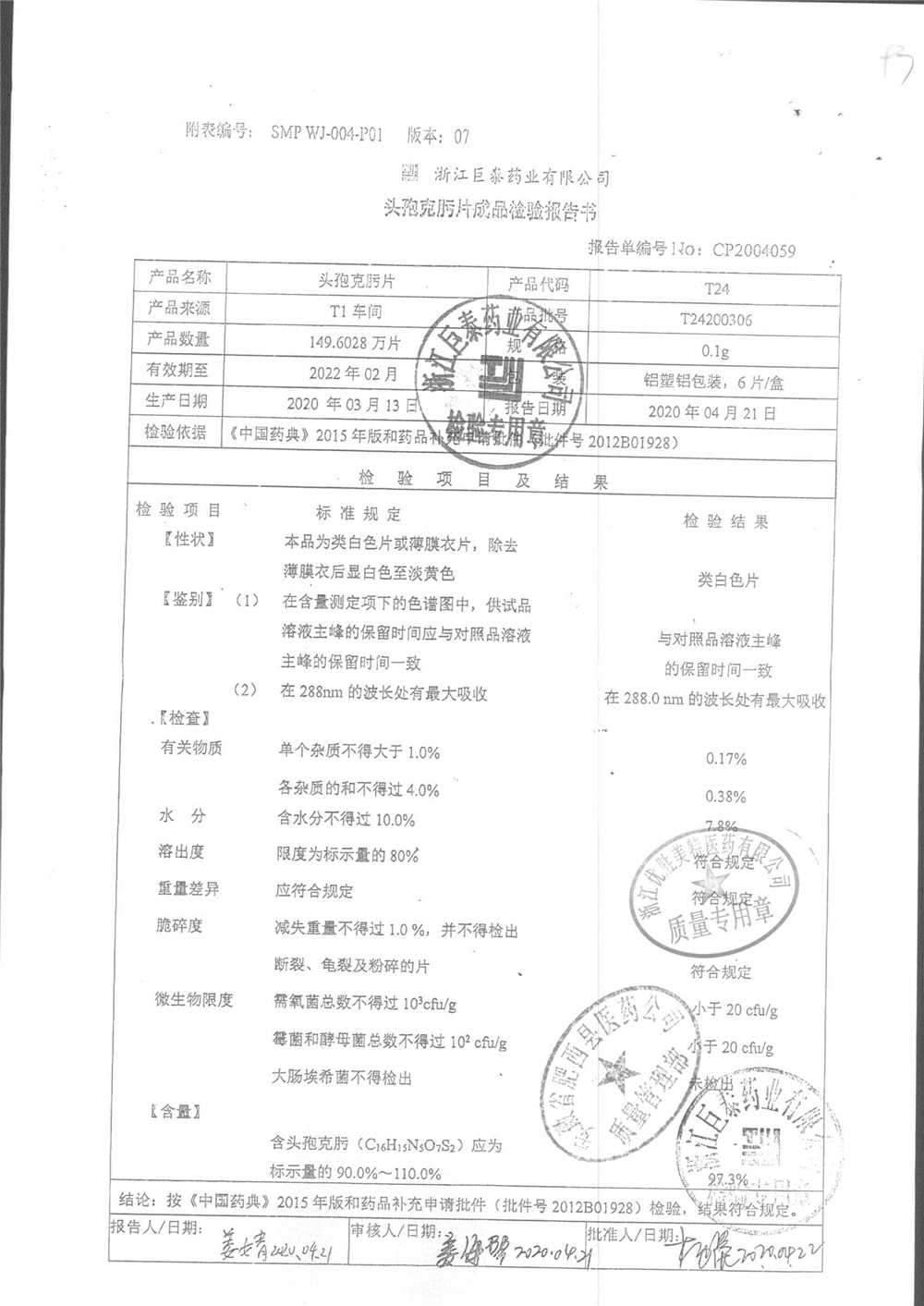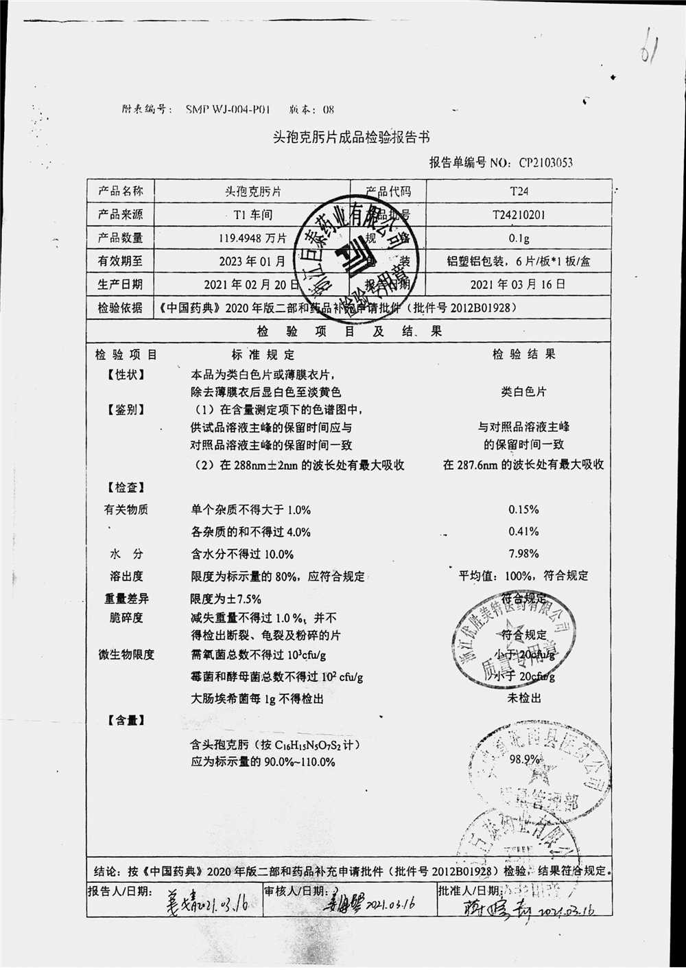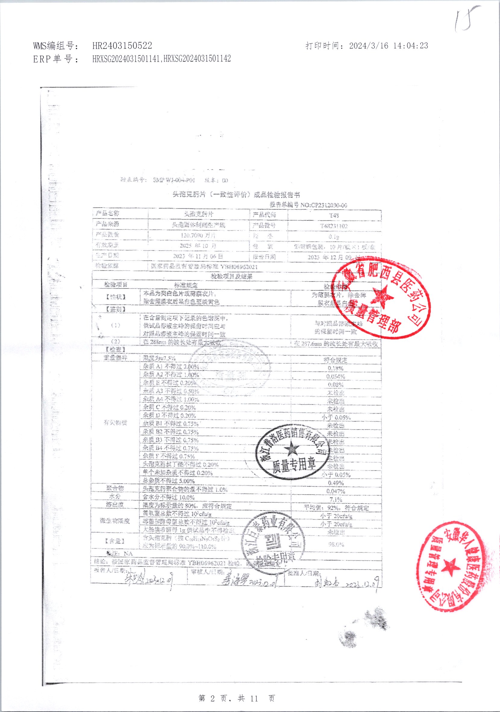 | 頭孢克肟片 | 0.1g*10s | T24210501 | 查看詳情 |