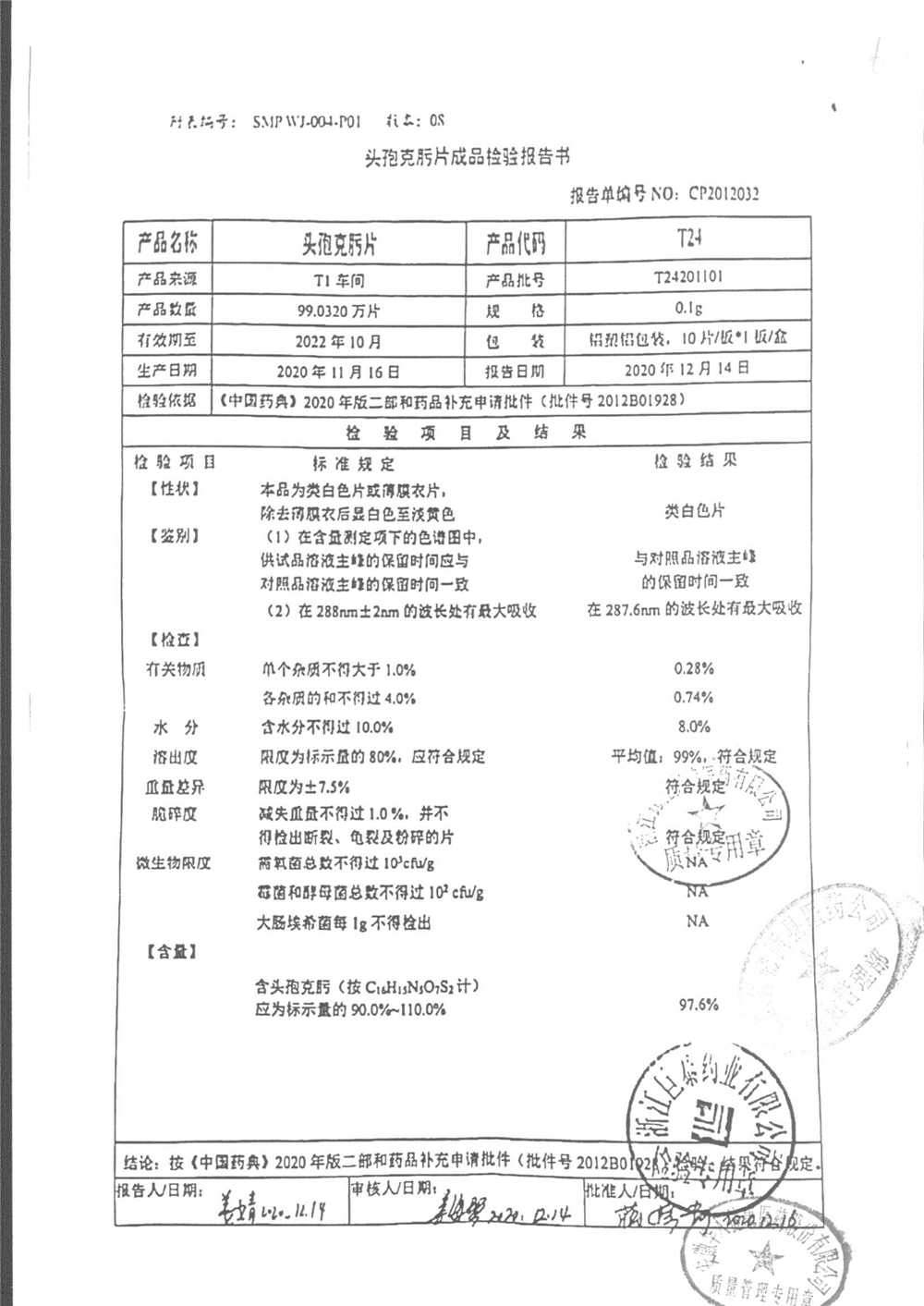 | 頭孢克肟片 | 0.1g*10s | T24191101 | 查看詳情 |
