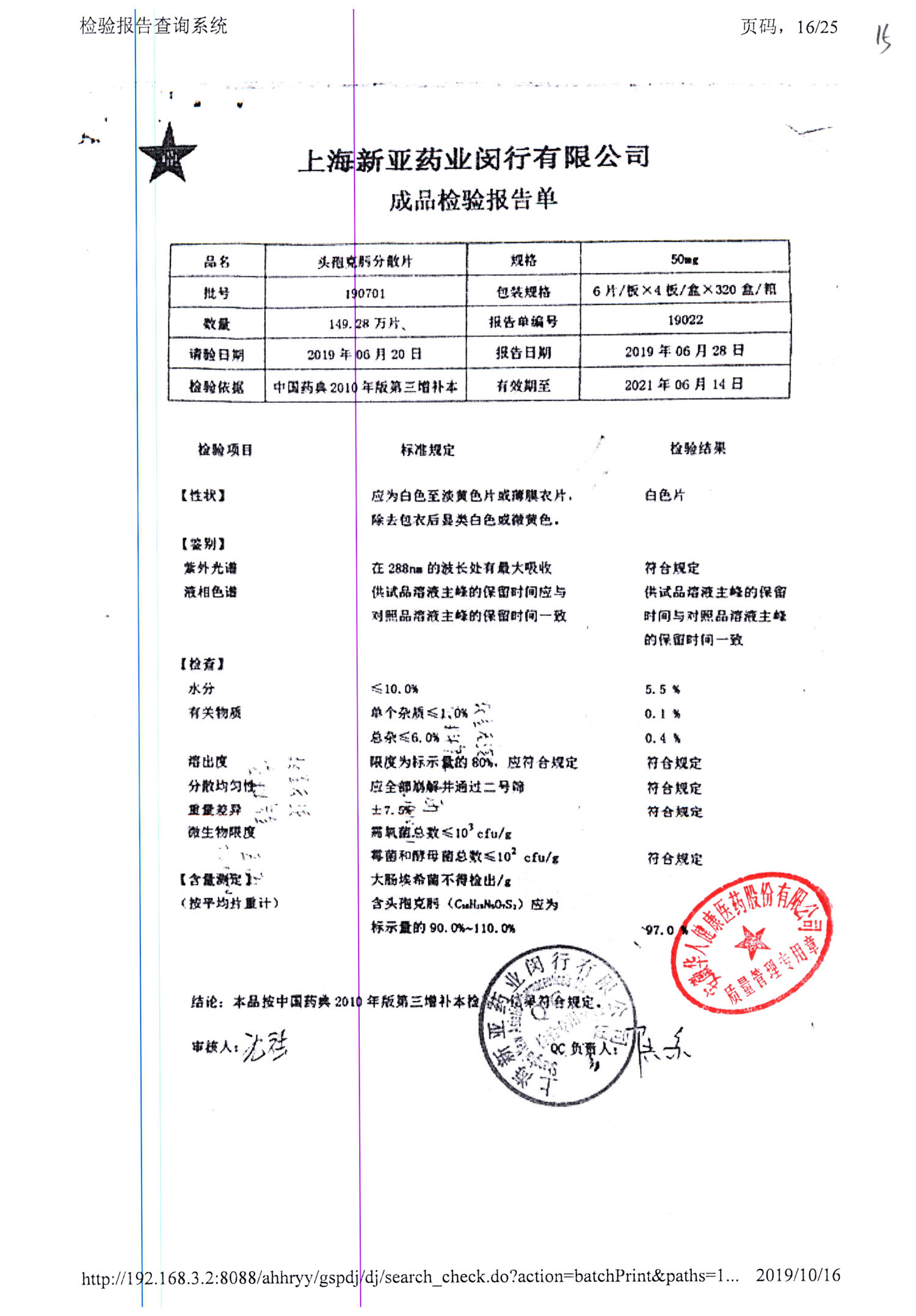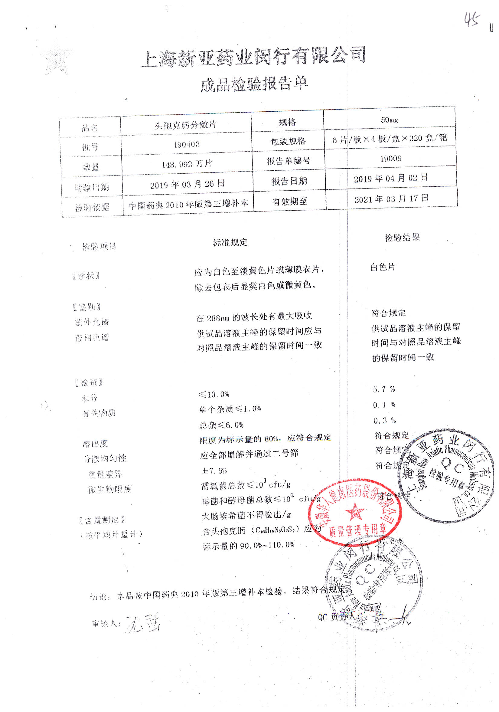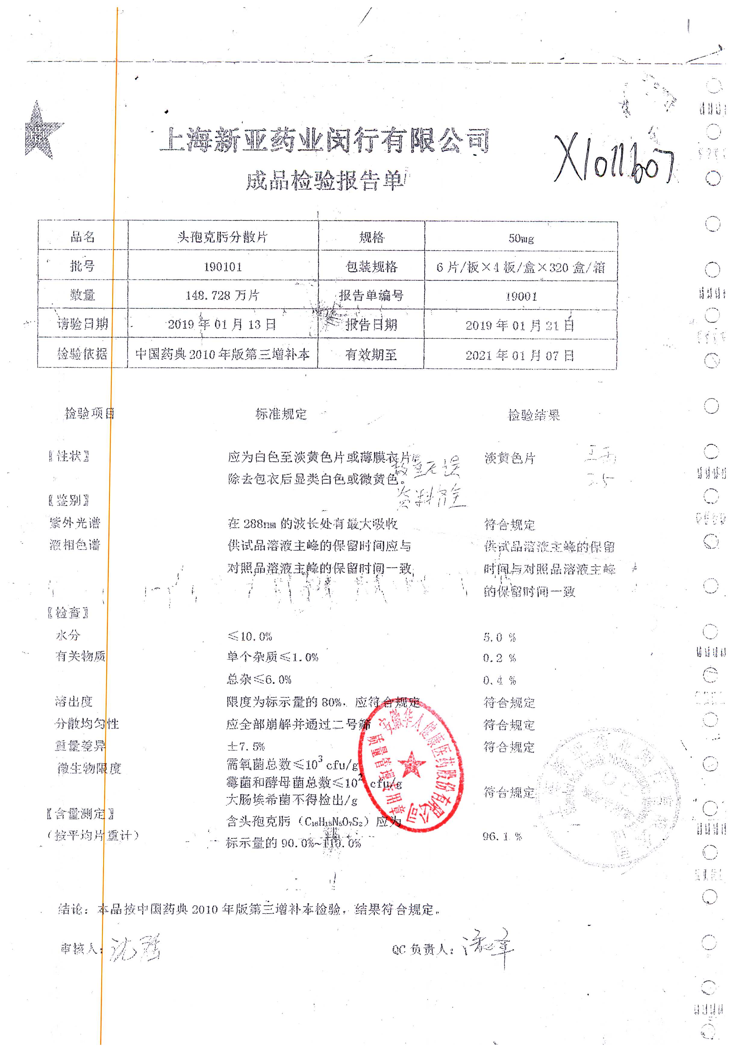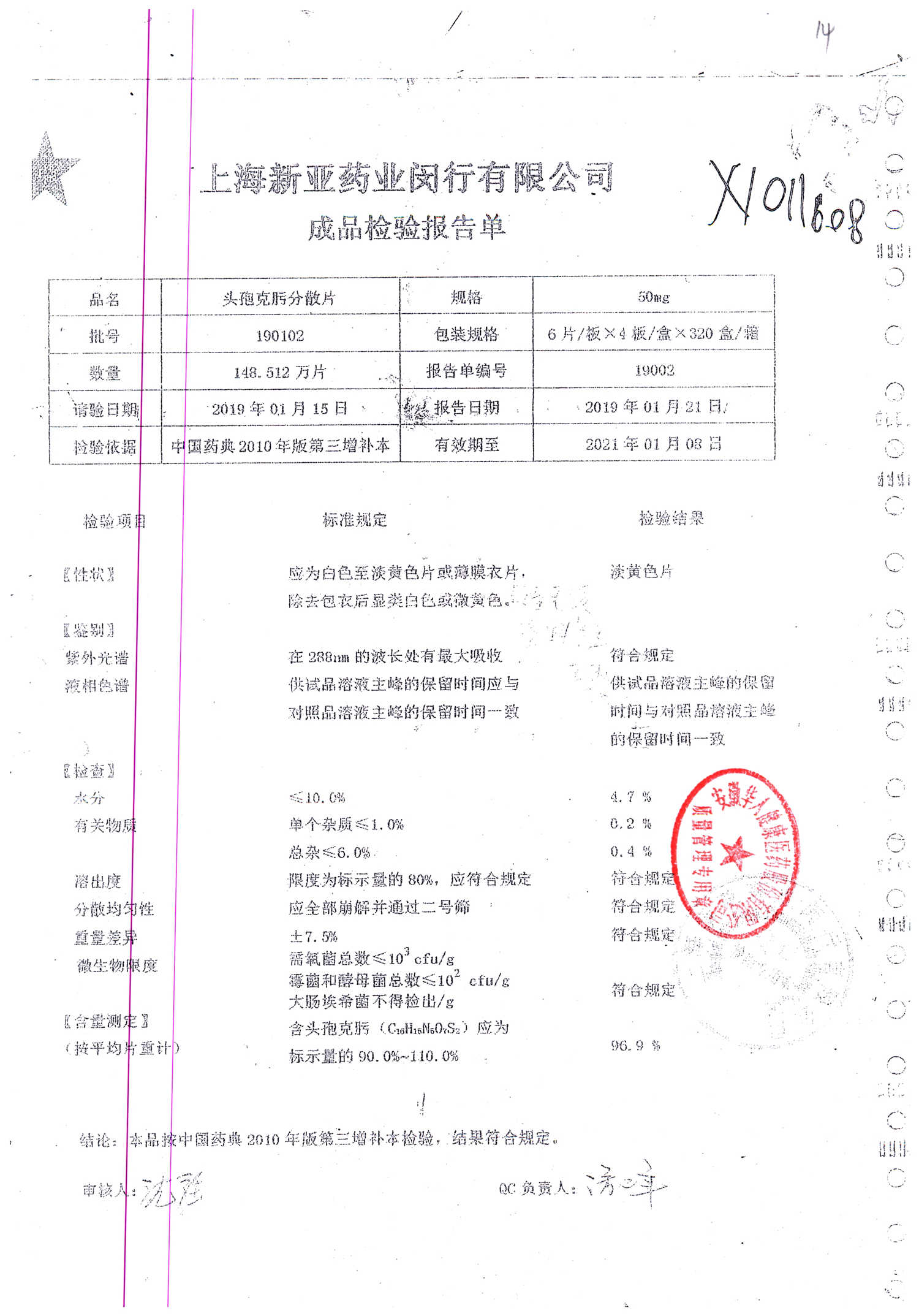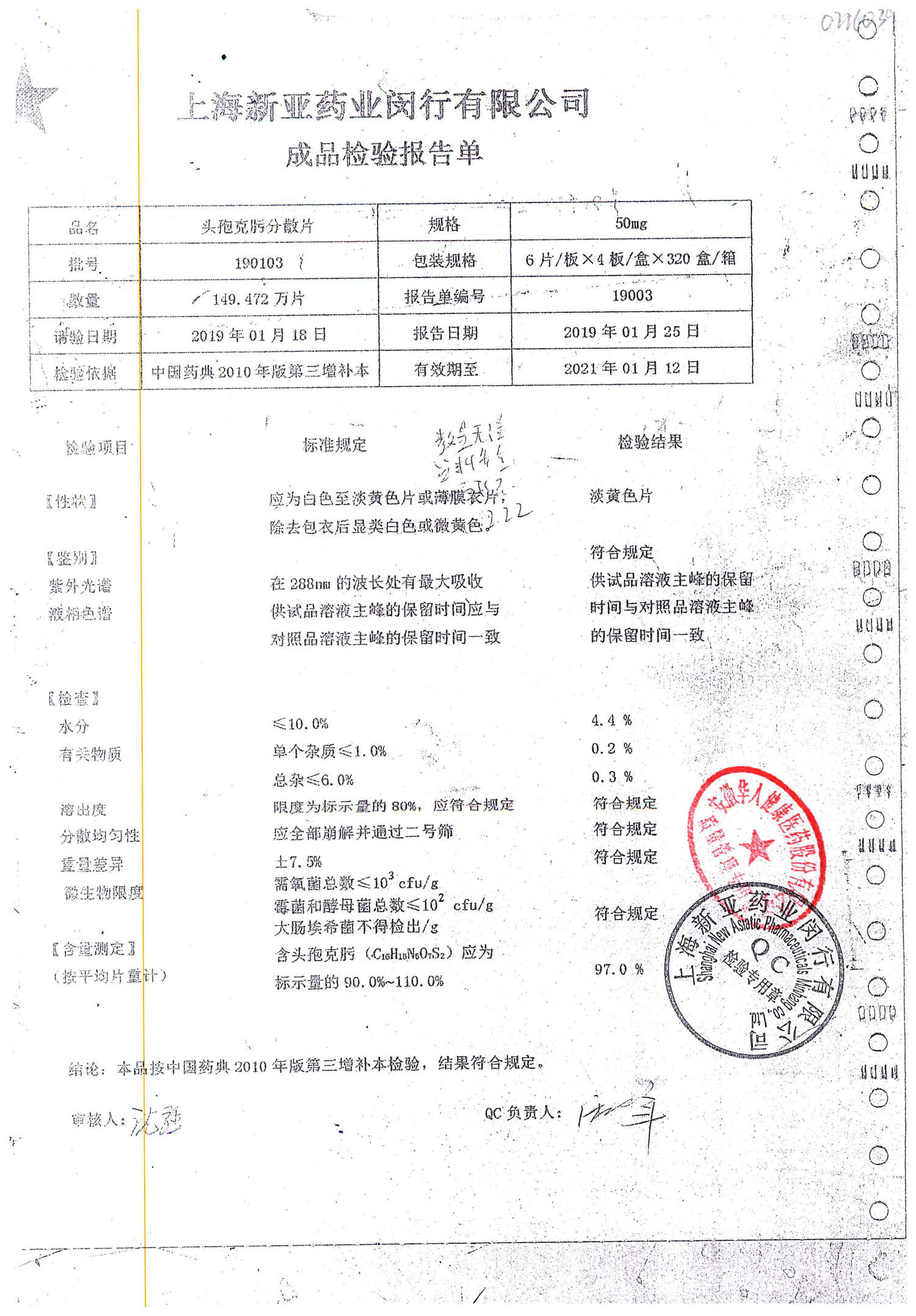 | 頭孢克肟分散片 | 50mg*24s | 190701 | 查看詳情 |