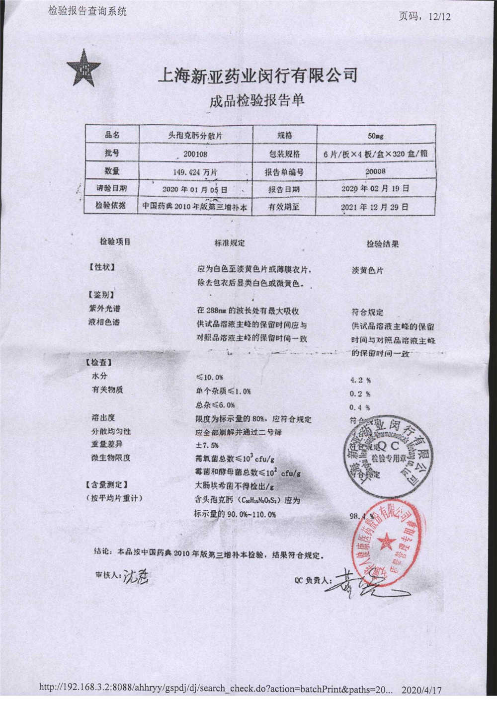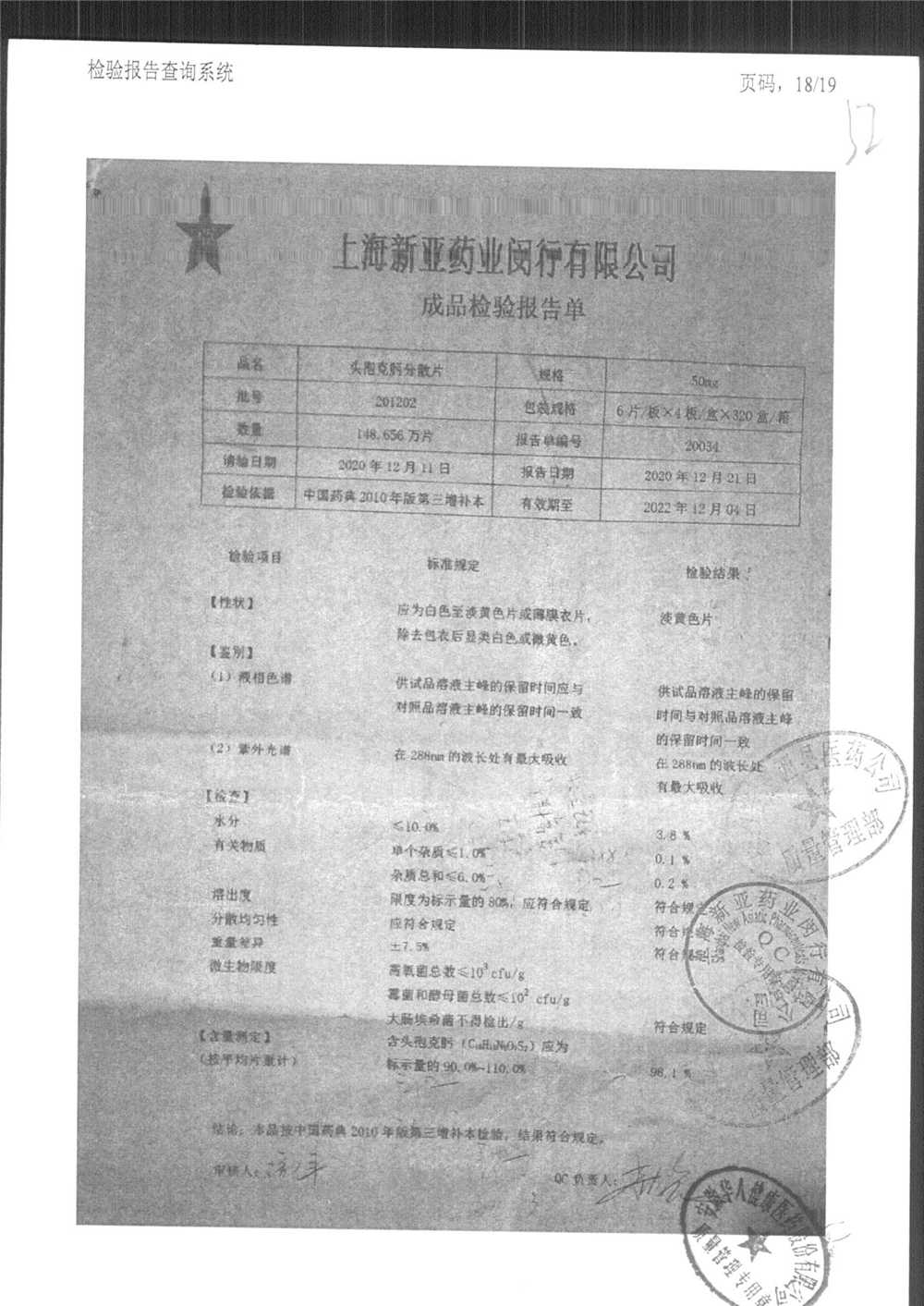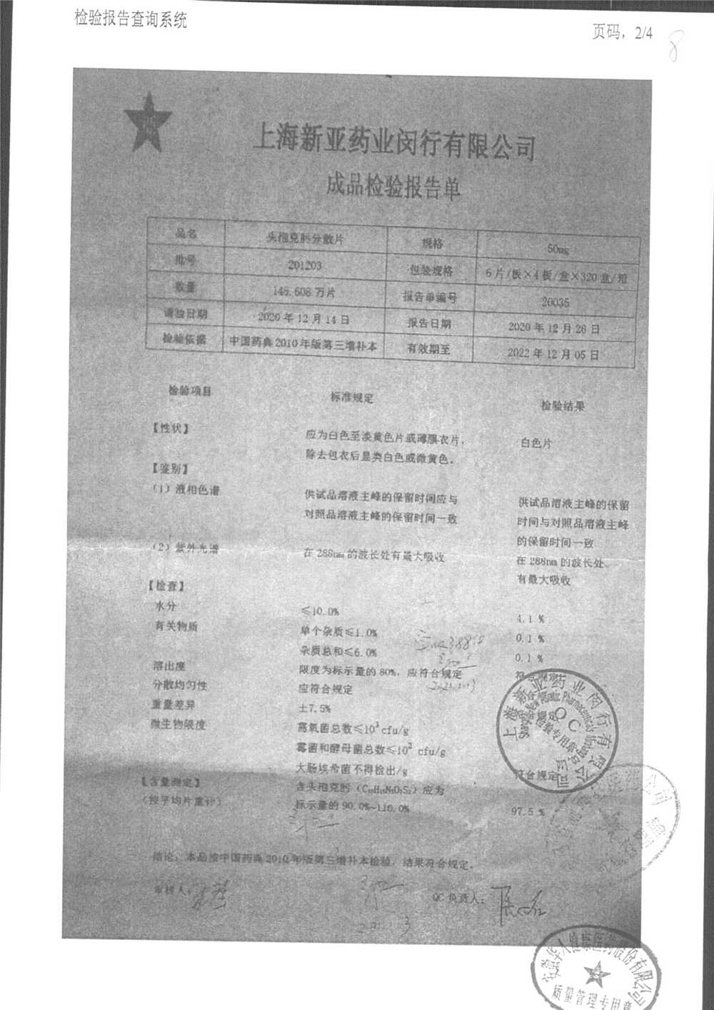 | 頭孢克肟分散片 | 50mg*24s | 191202 | 查看詳情 |