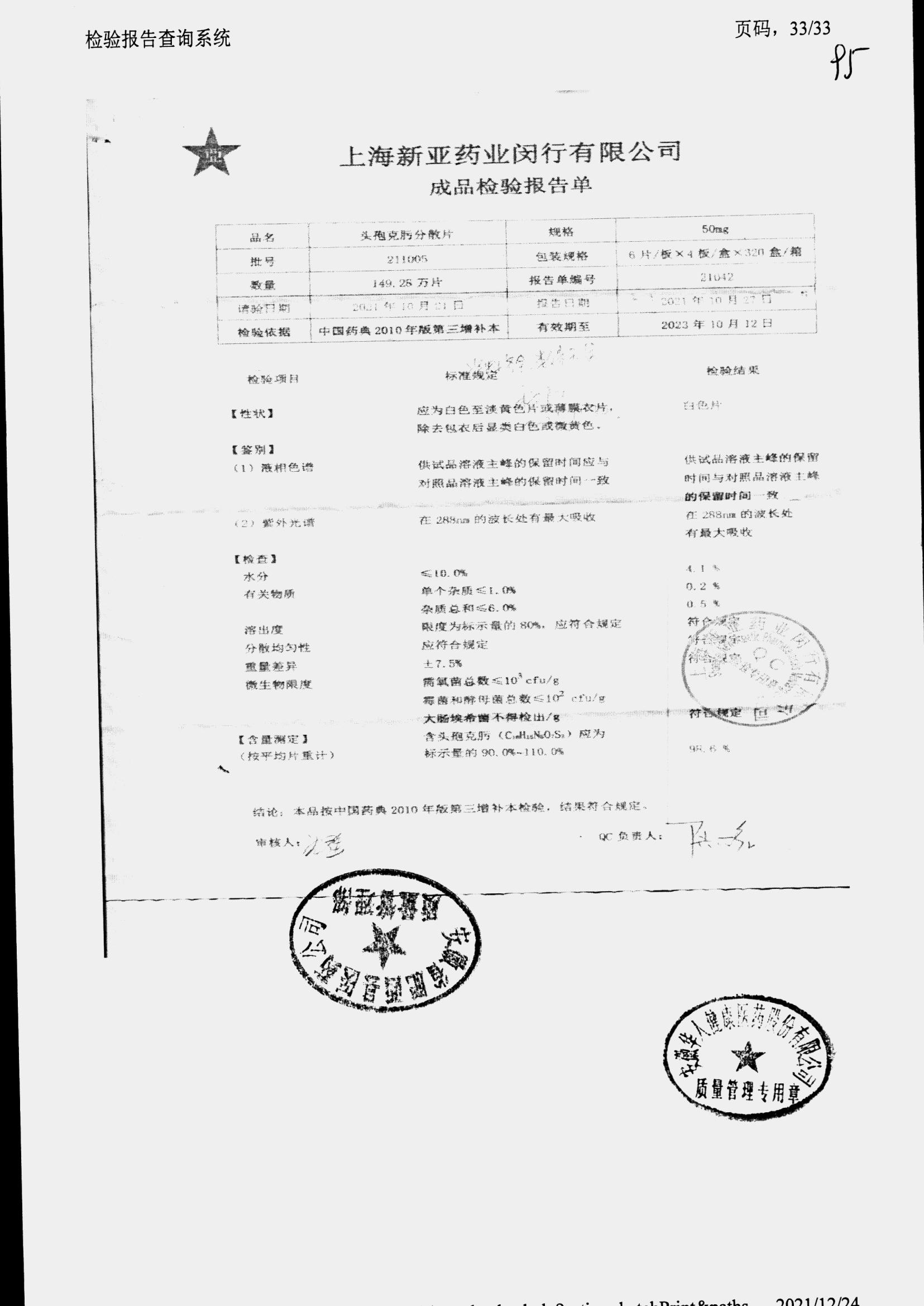 | 頭孢克肟分散片 | 50mg*24s | 210404 | 查看詳情 |