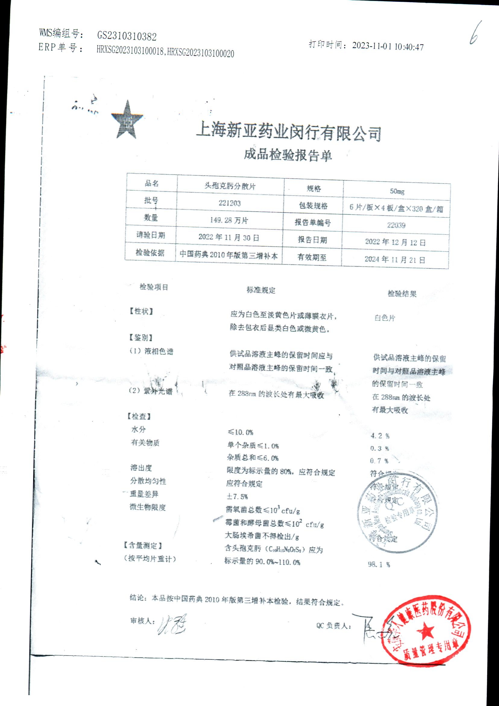 | 頭孢克肟分散片 | 50mg*24s | 211103 | 查看詳情 |