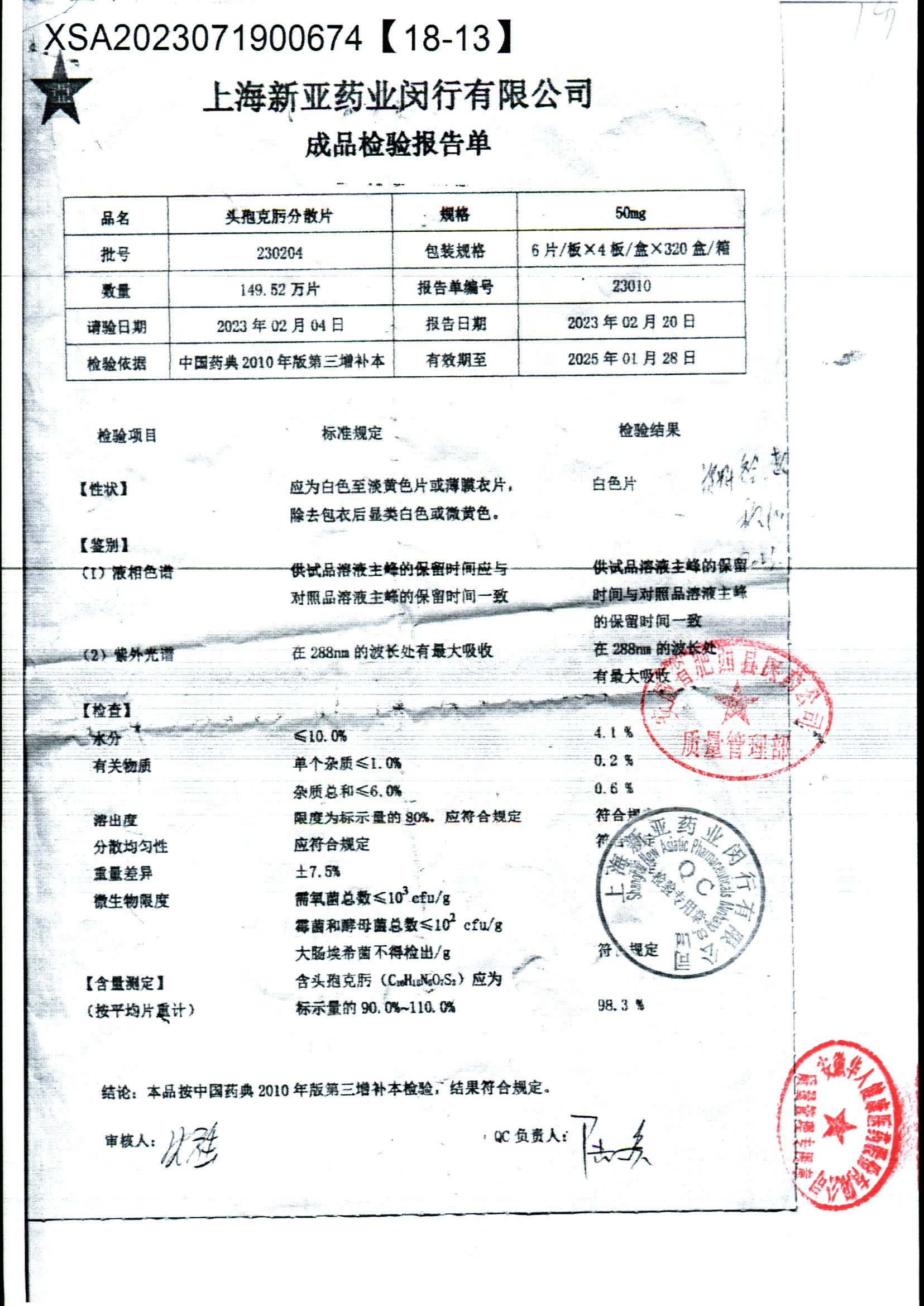 | 頭孢克肟分散片 | 50mg*24s | 230404 | 查看詳情 |