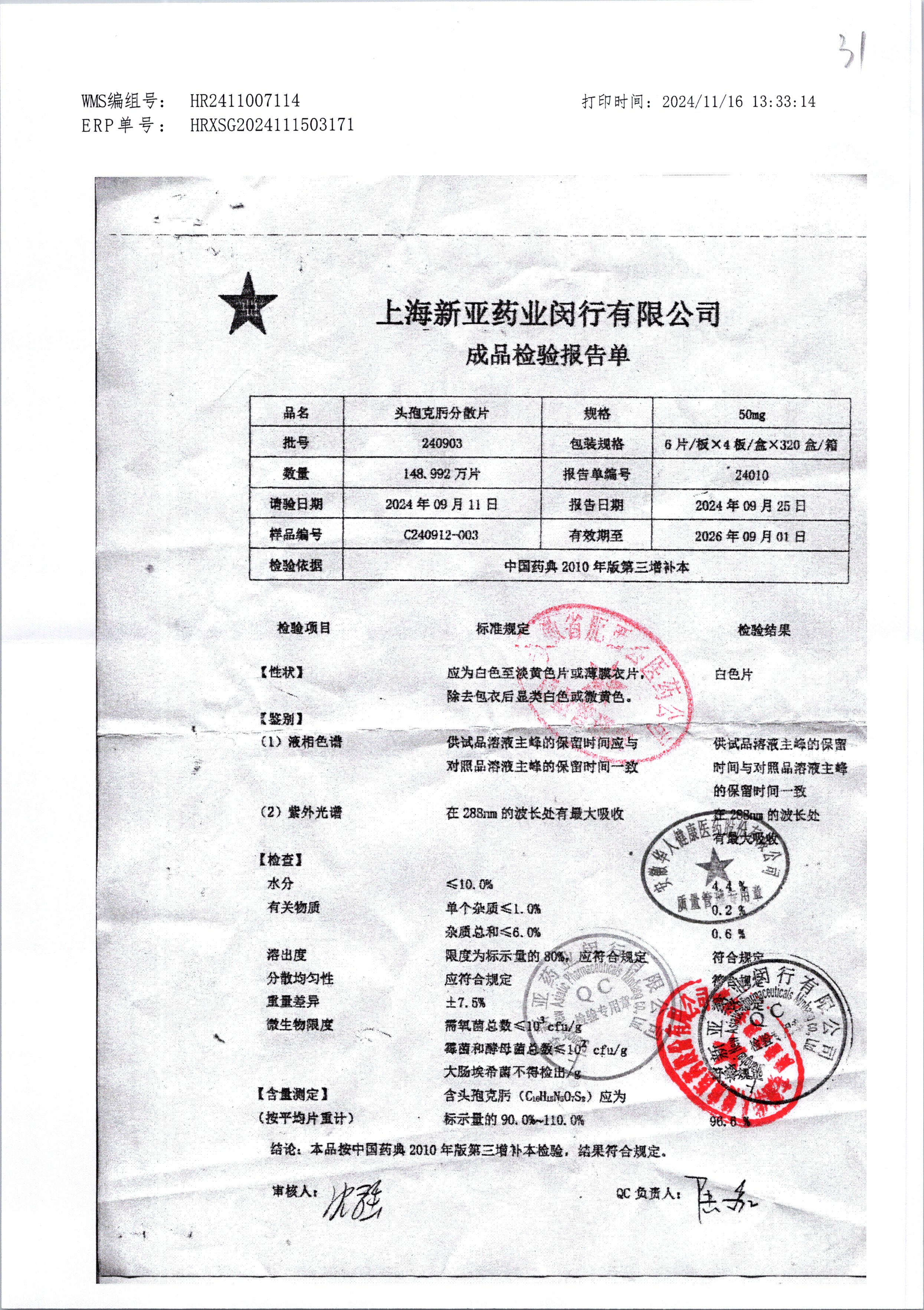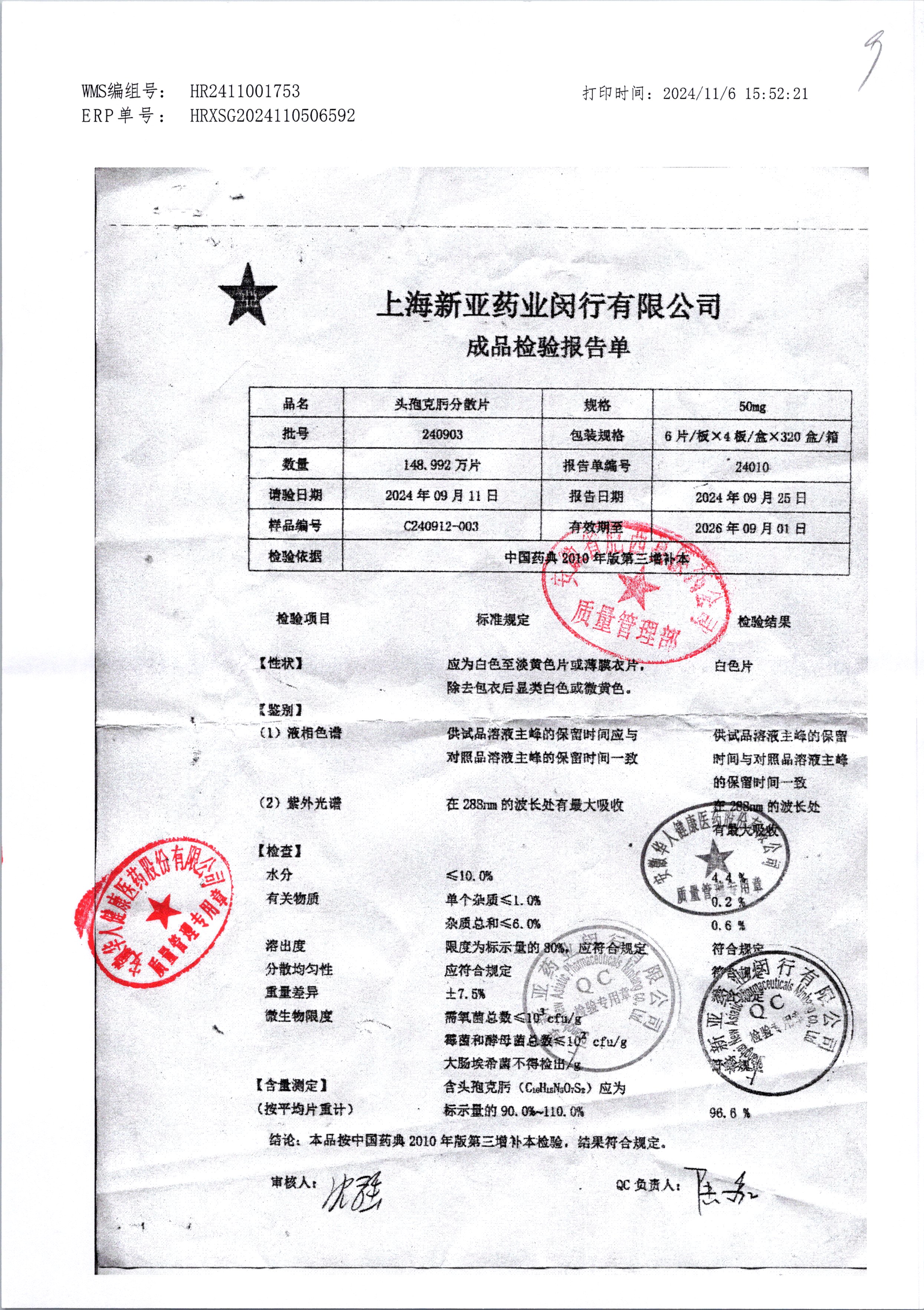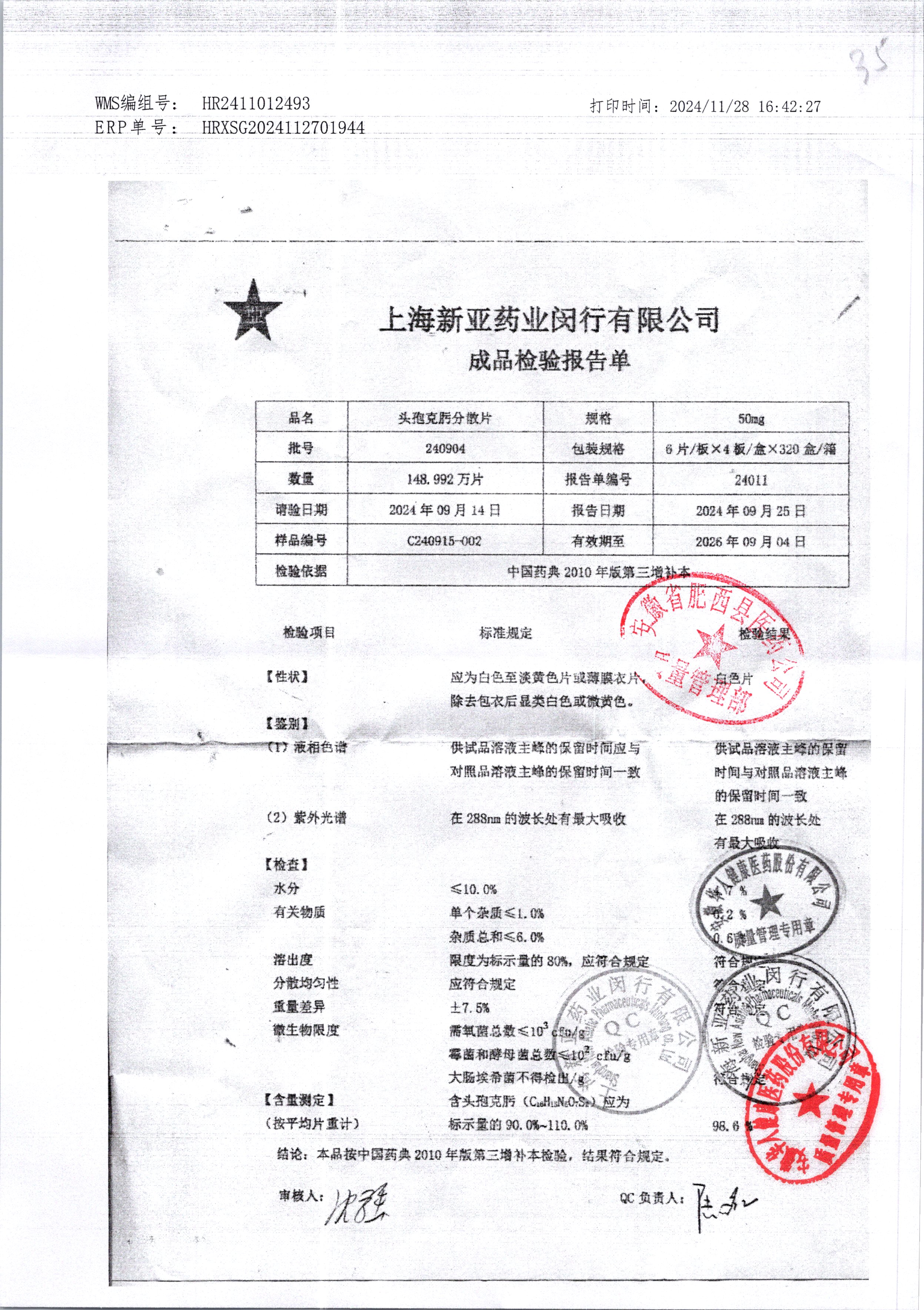 | 頭孢克肟分散片 | 50mg*24s | 240904 | 查看詳情 |