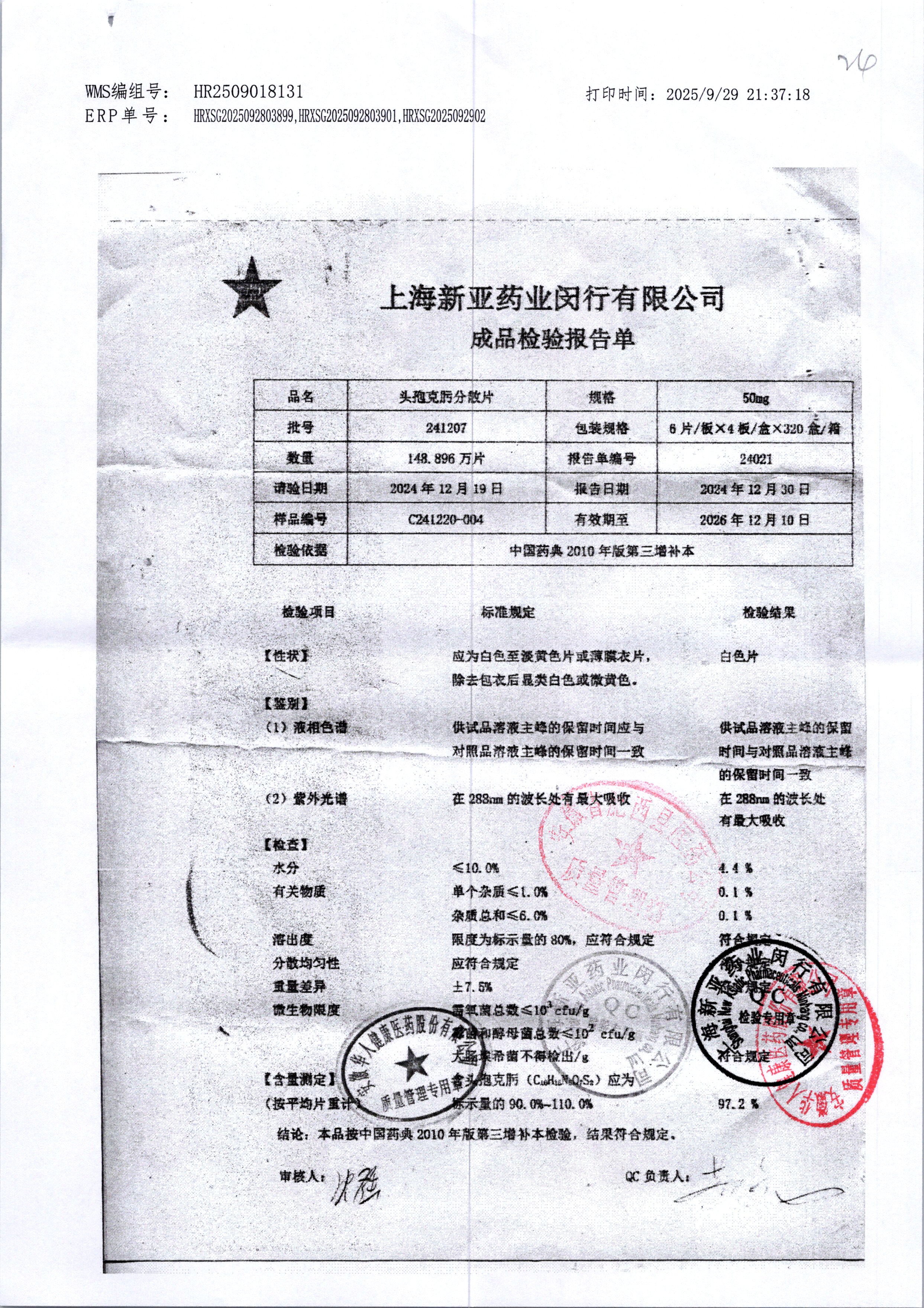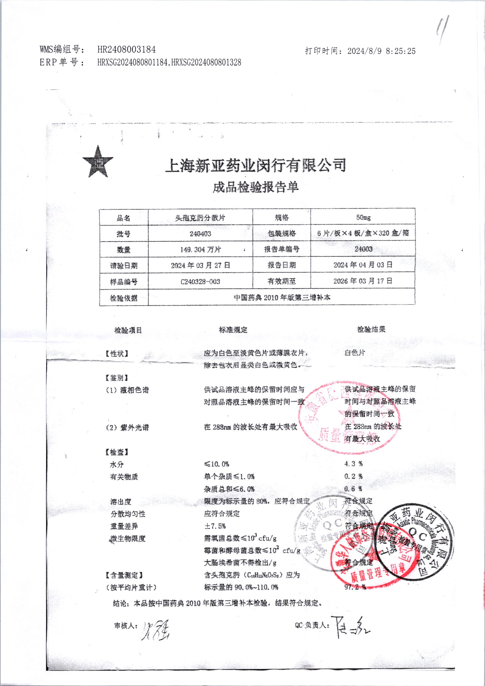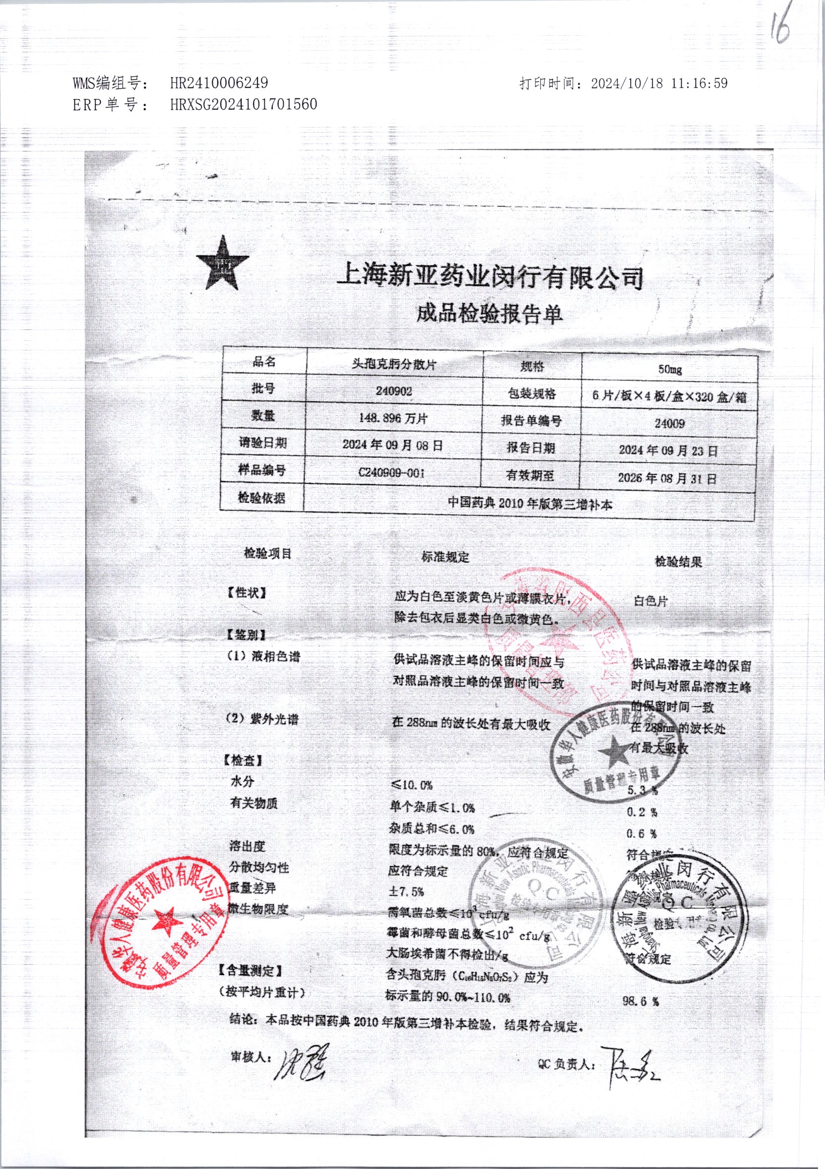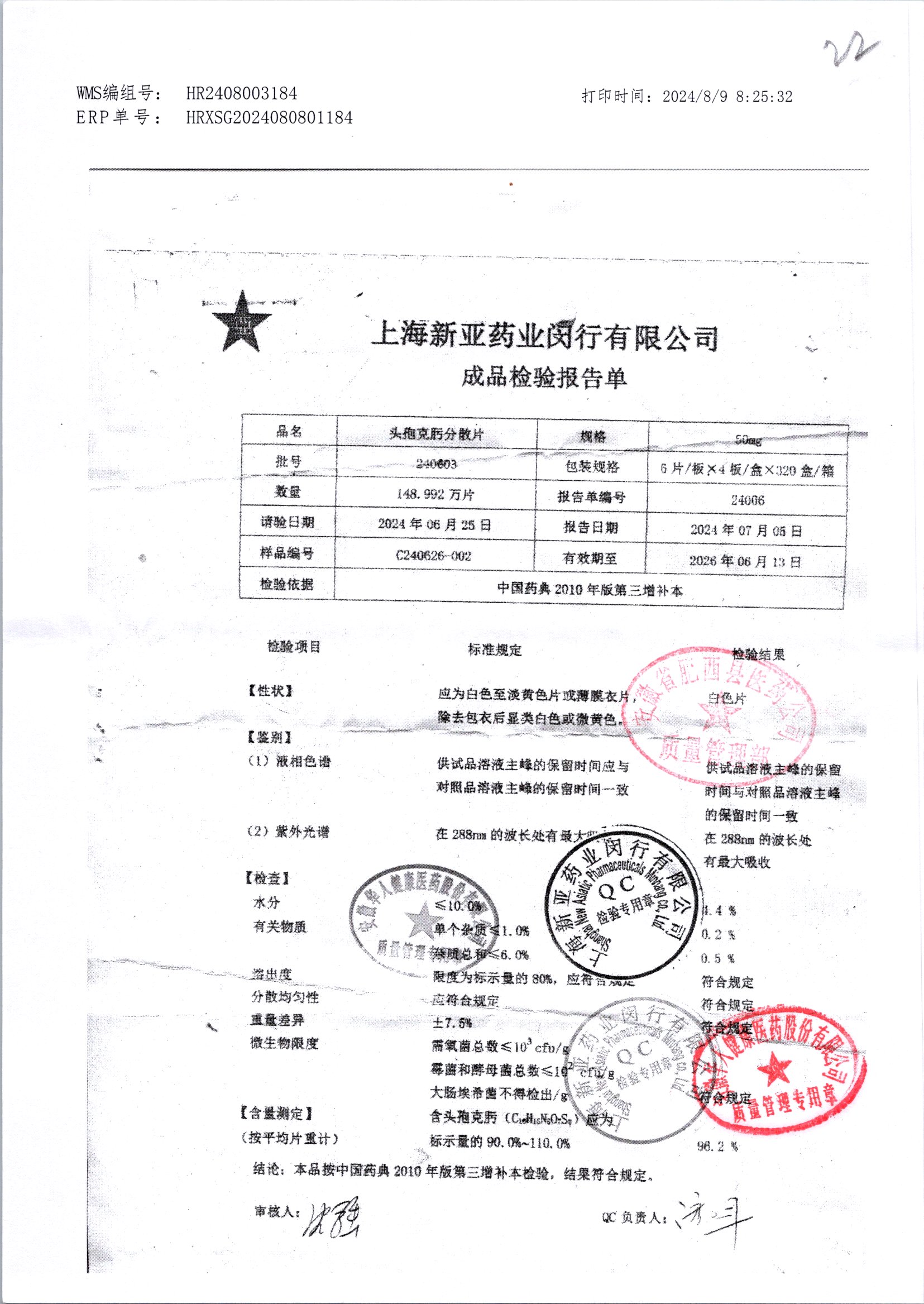| 頭孢克肟分散片 | 50mg*24s | 240904 | 查看詳情 |