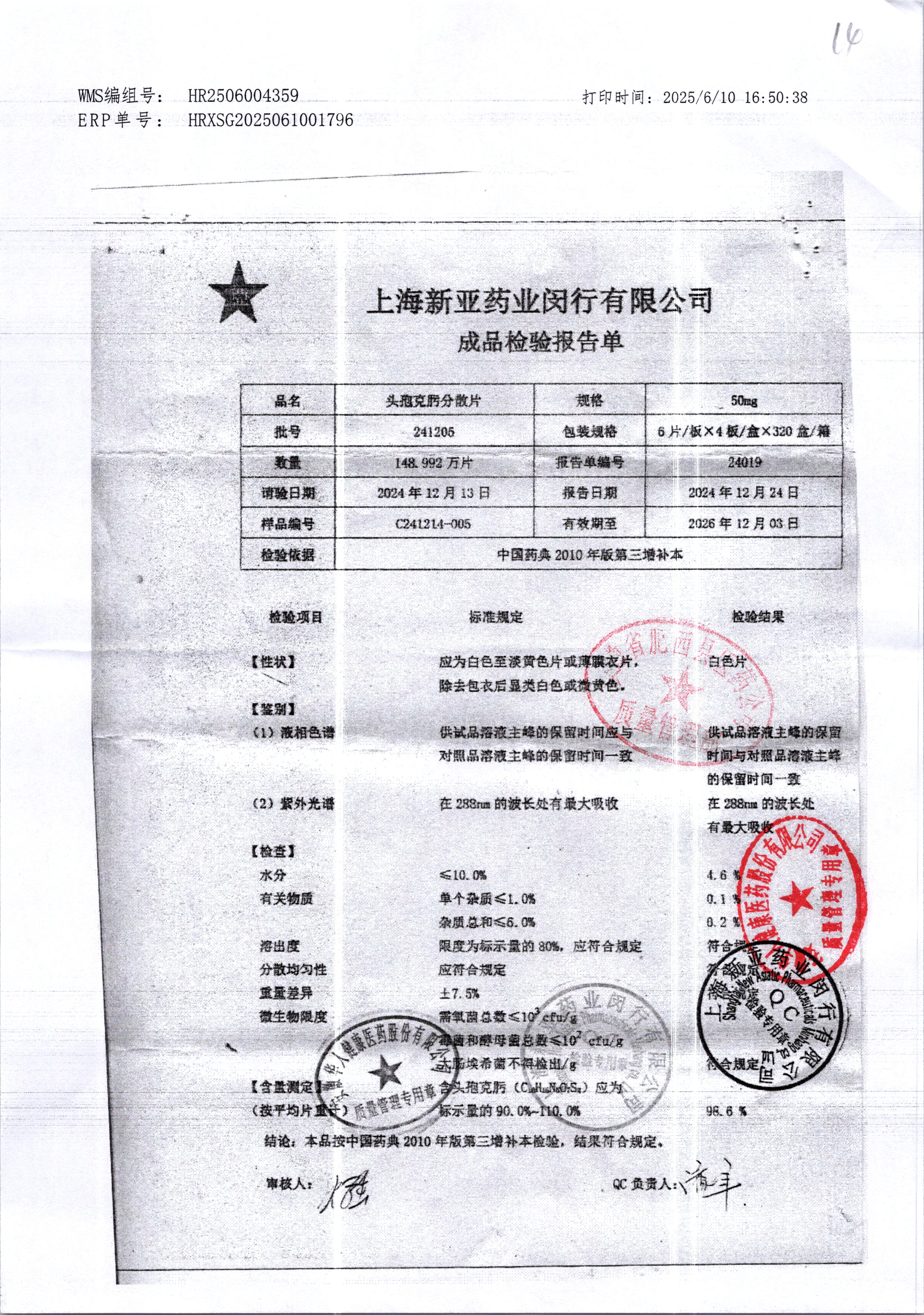 | 頭孢克肟分散片 | 50mg*24s | 241203 | 查看詳情 |