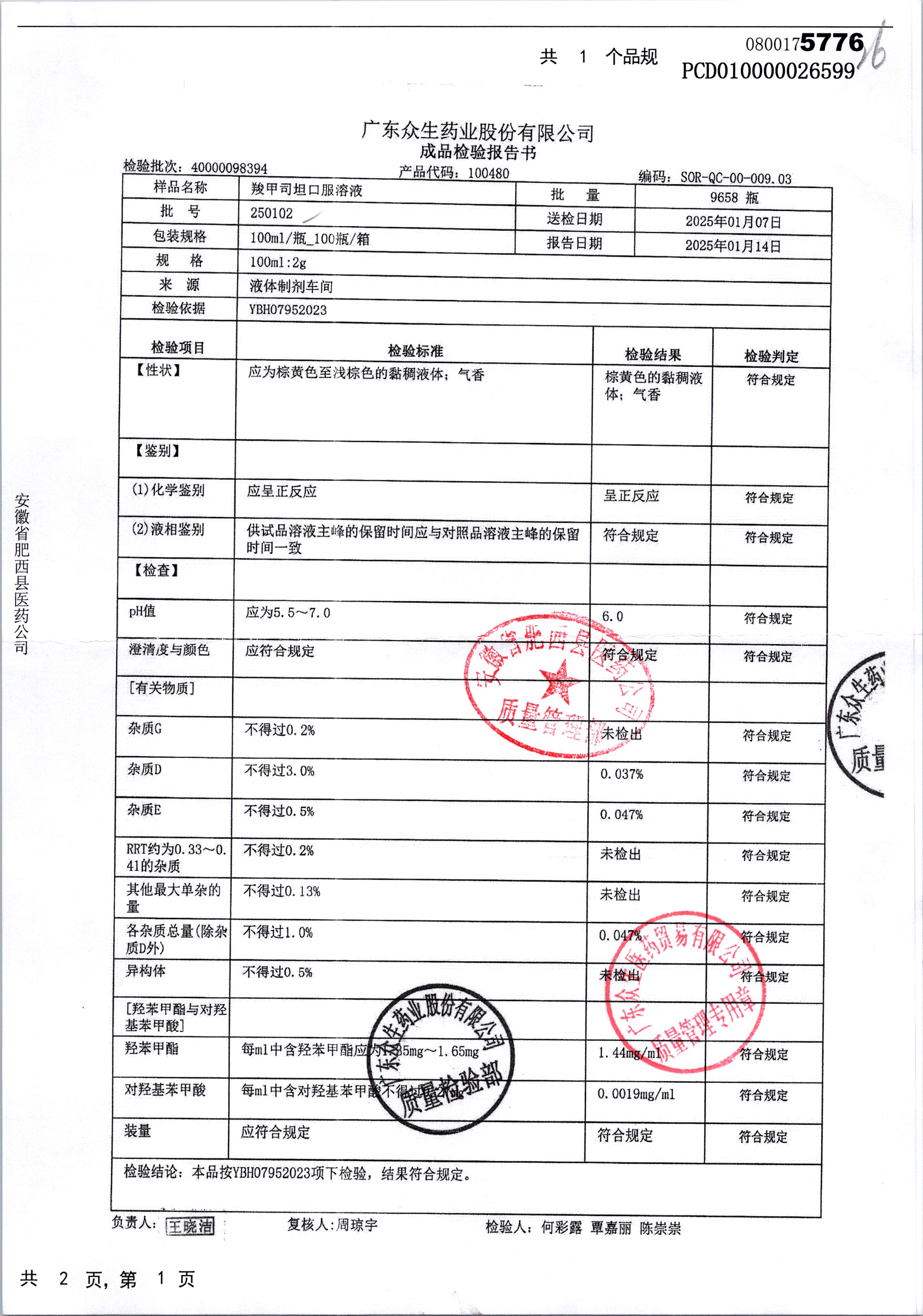 羧甲司坦口服溶液 100ml:2g 250102 查看詳情