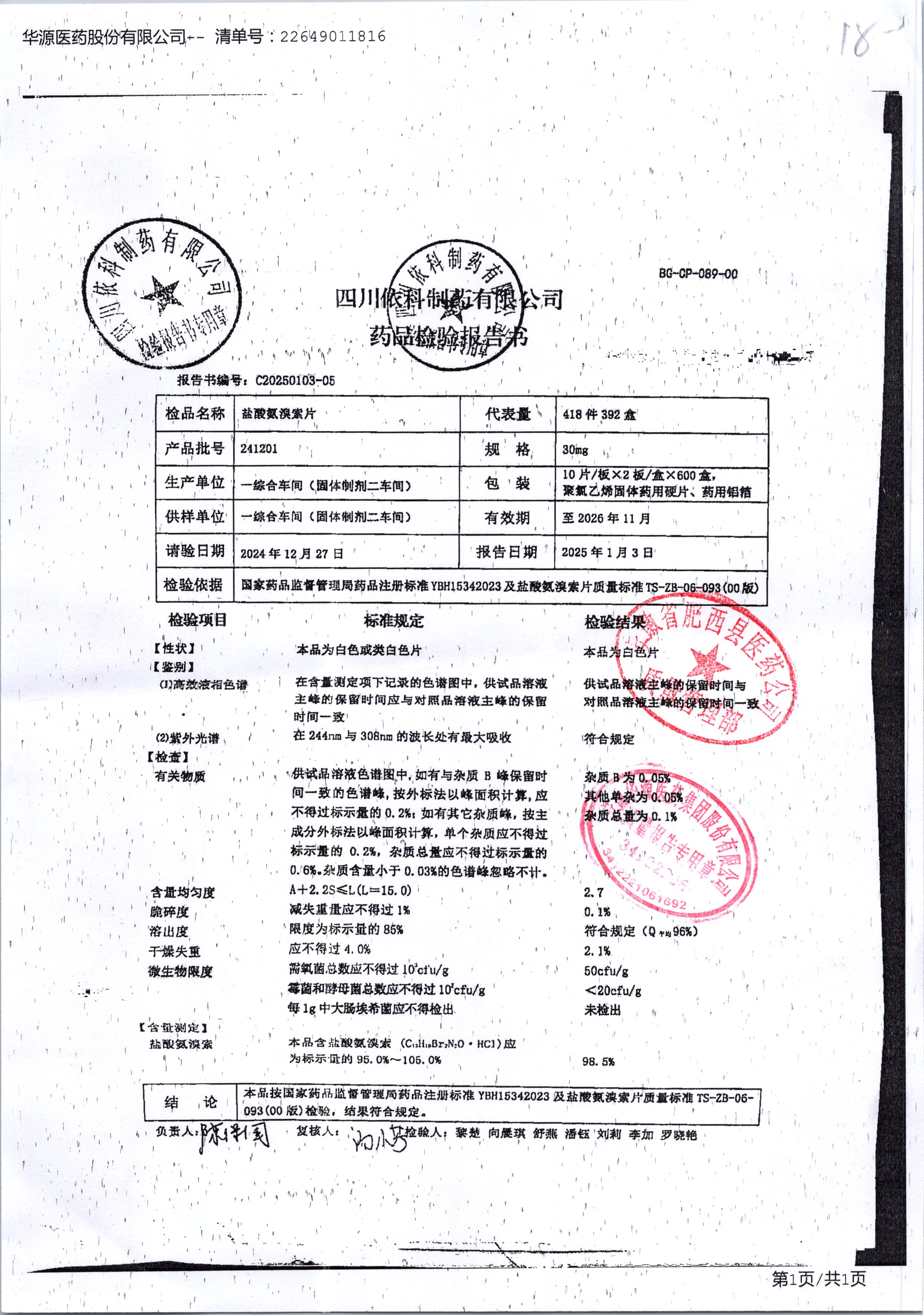 鹽酸氨溴索片 30mg 241201 查看詳情
