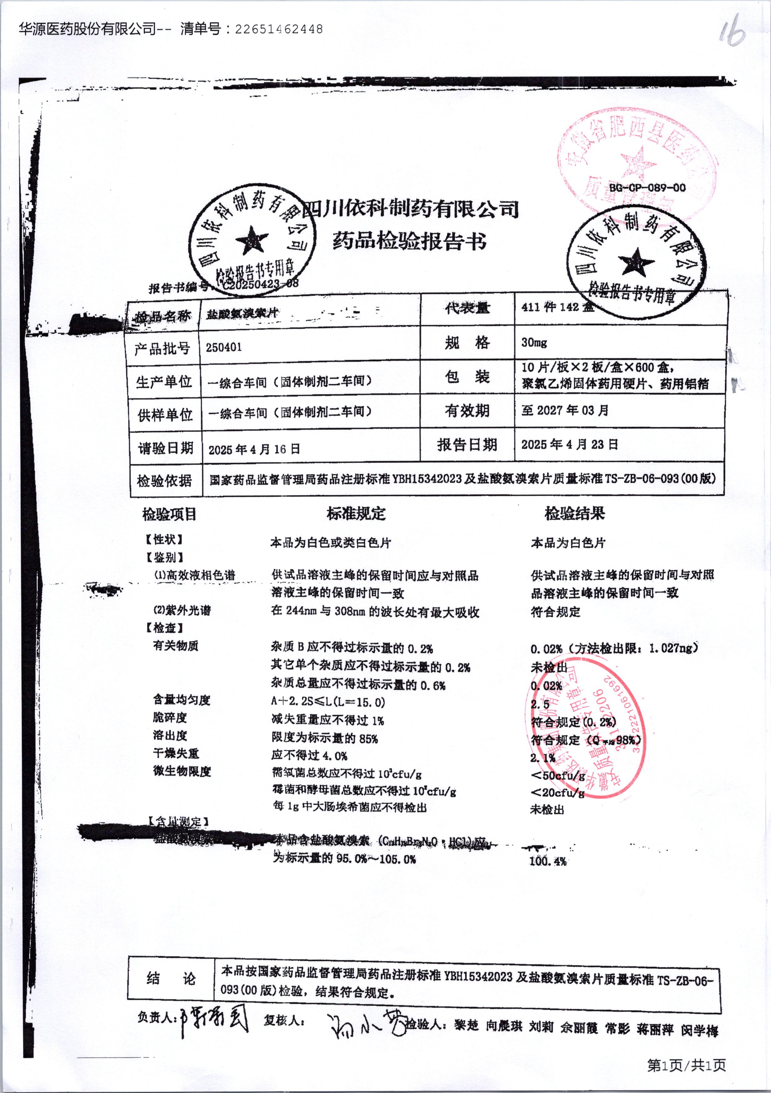鹽酸氨溴索片 30mg 250401 查看詳情