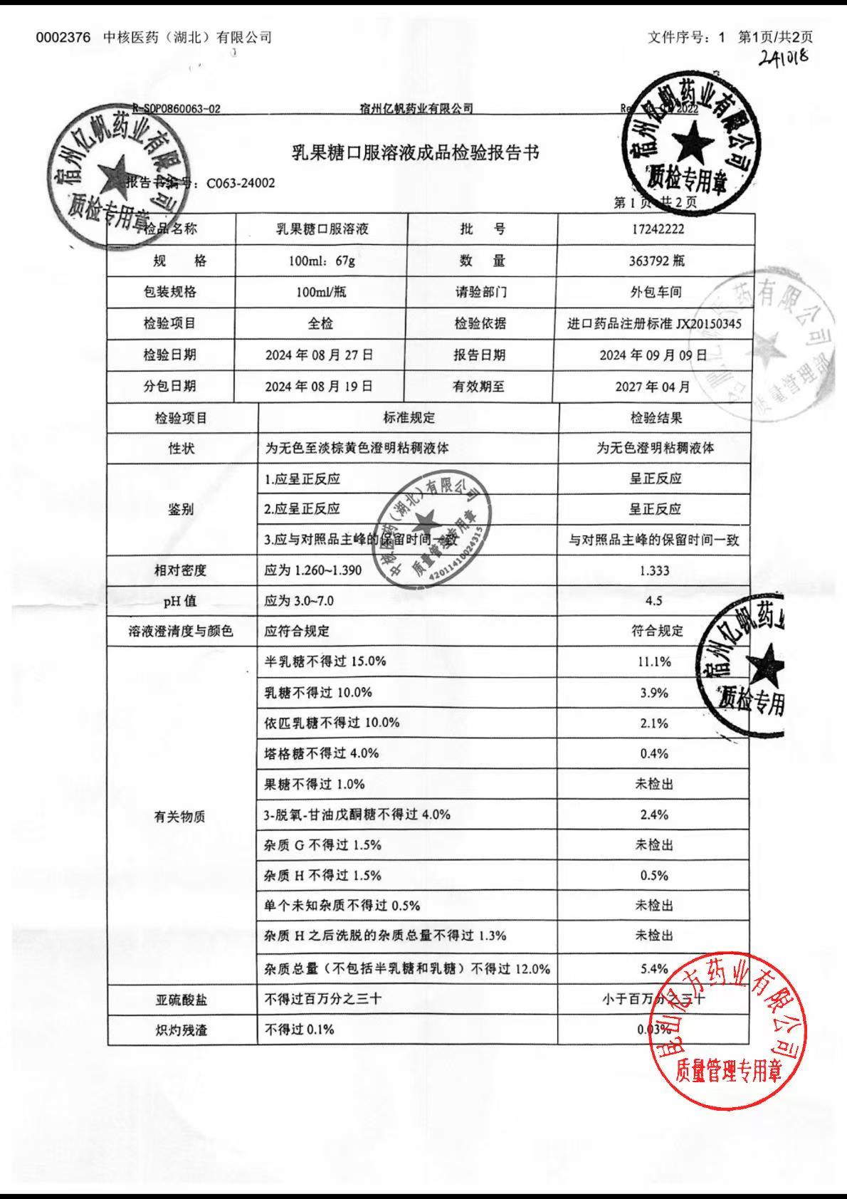 | 乳果糖口服溶液 | 100ml:67g | 17244033/1 | 查看詳情 |