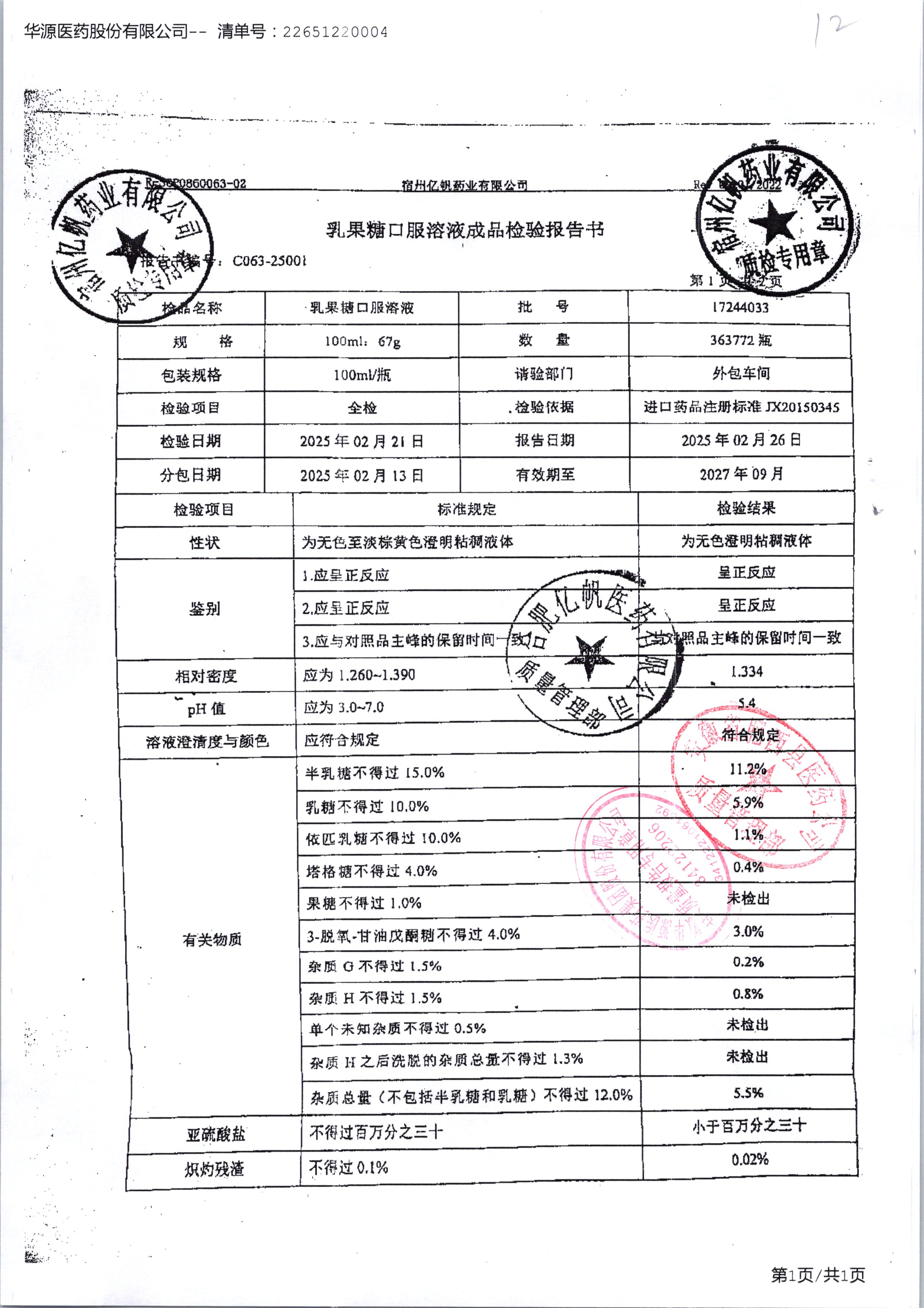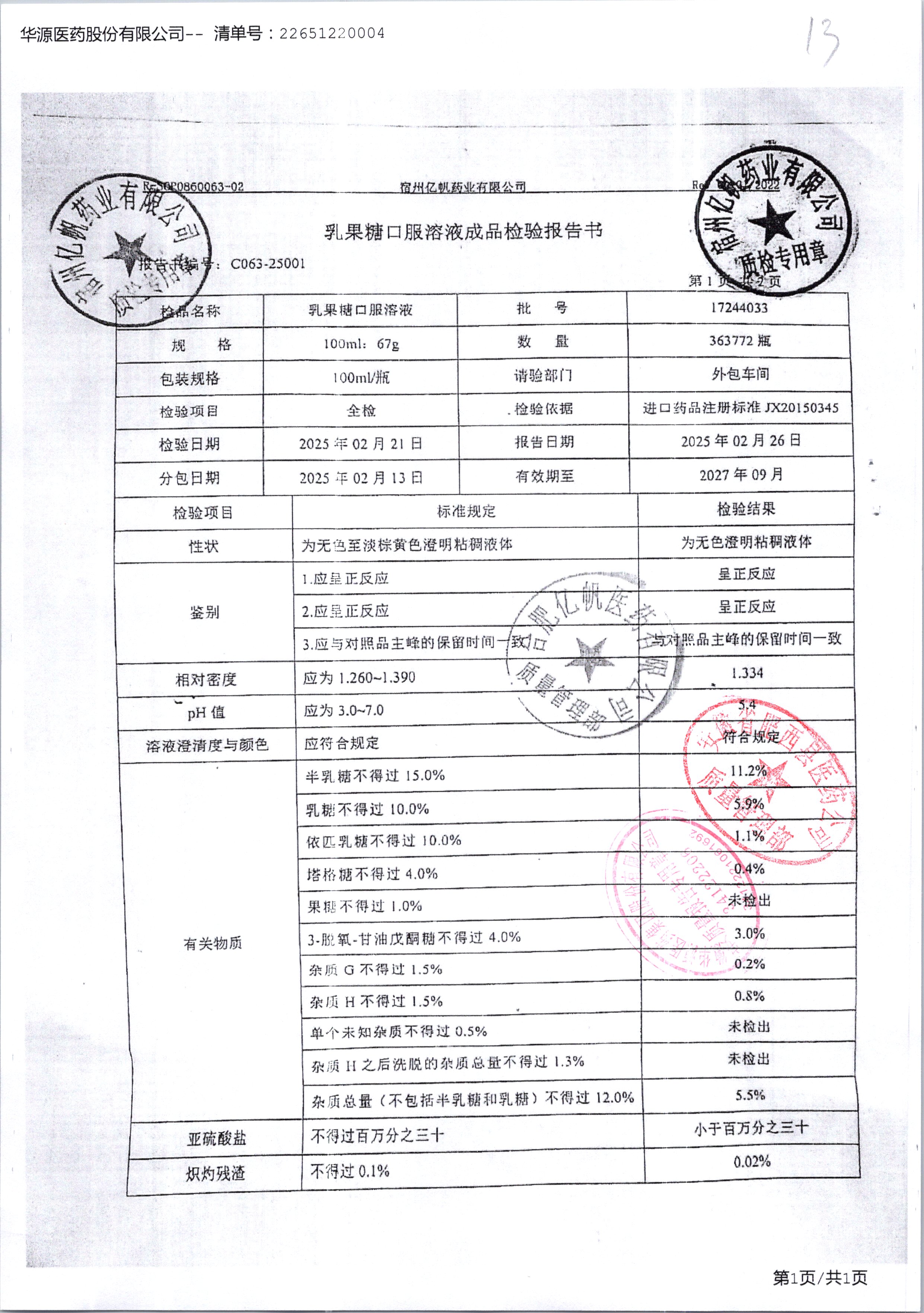 | 乳果糖口服溶液 | 100ml:67g | 17242222/2 | 查看詳情 |