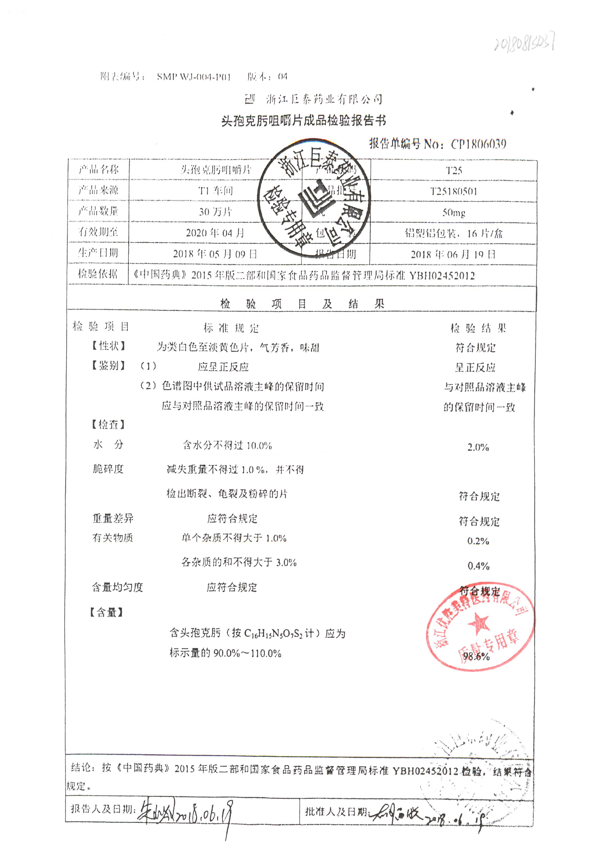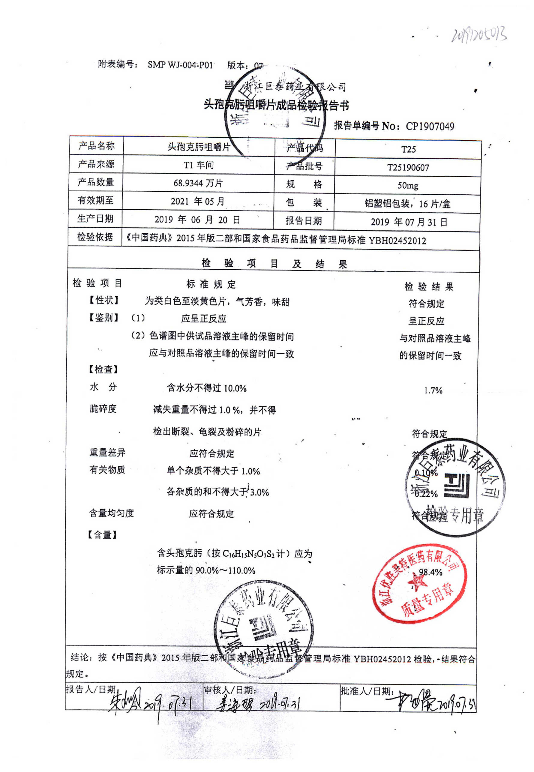 頭孢克肟咀嚼片 | 50mg*16s | T25190301 | 查看詳情 |