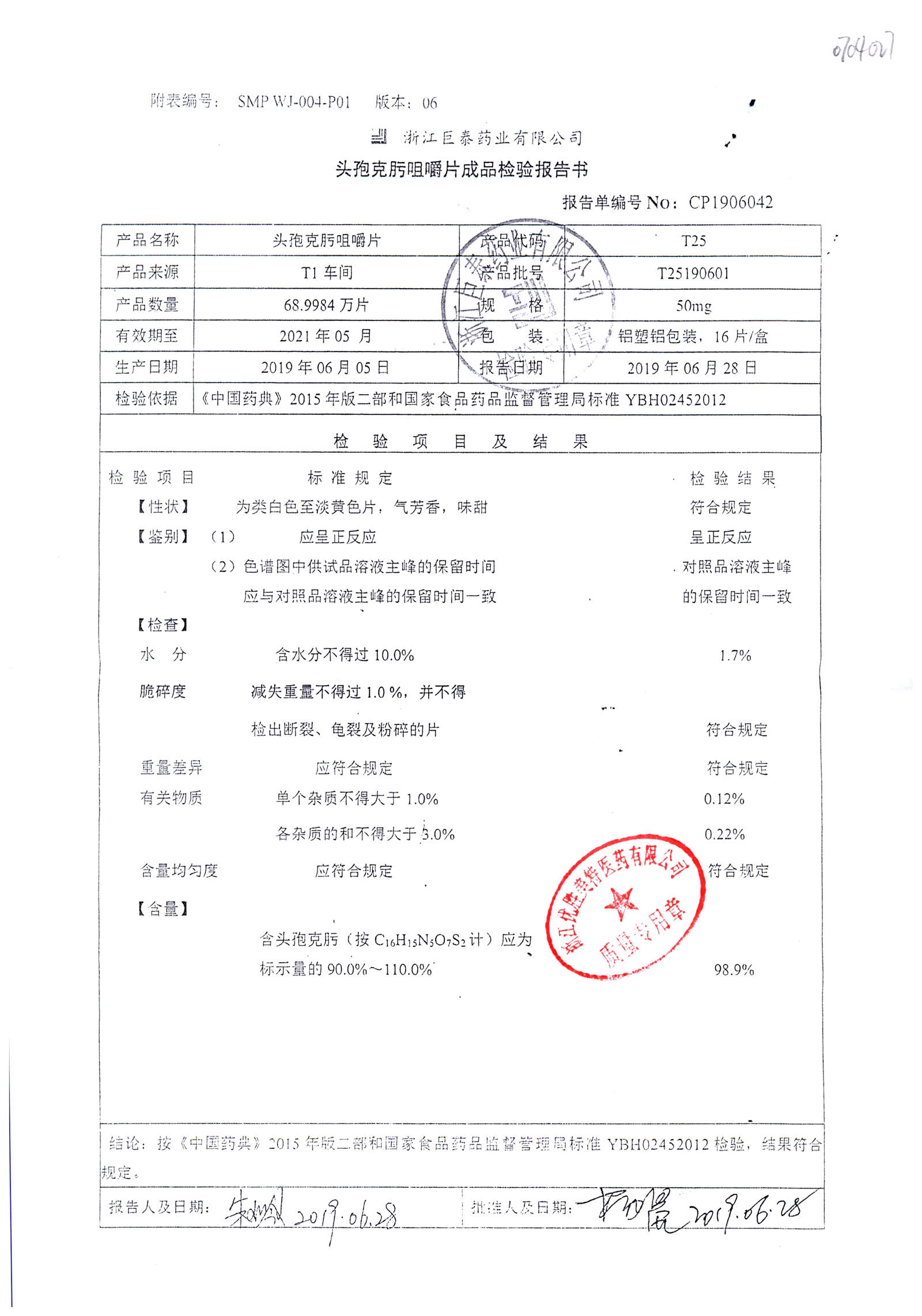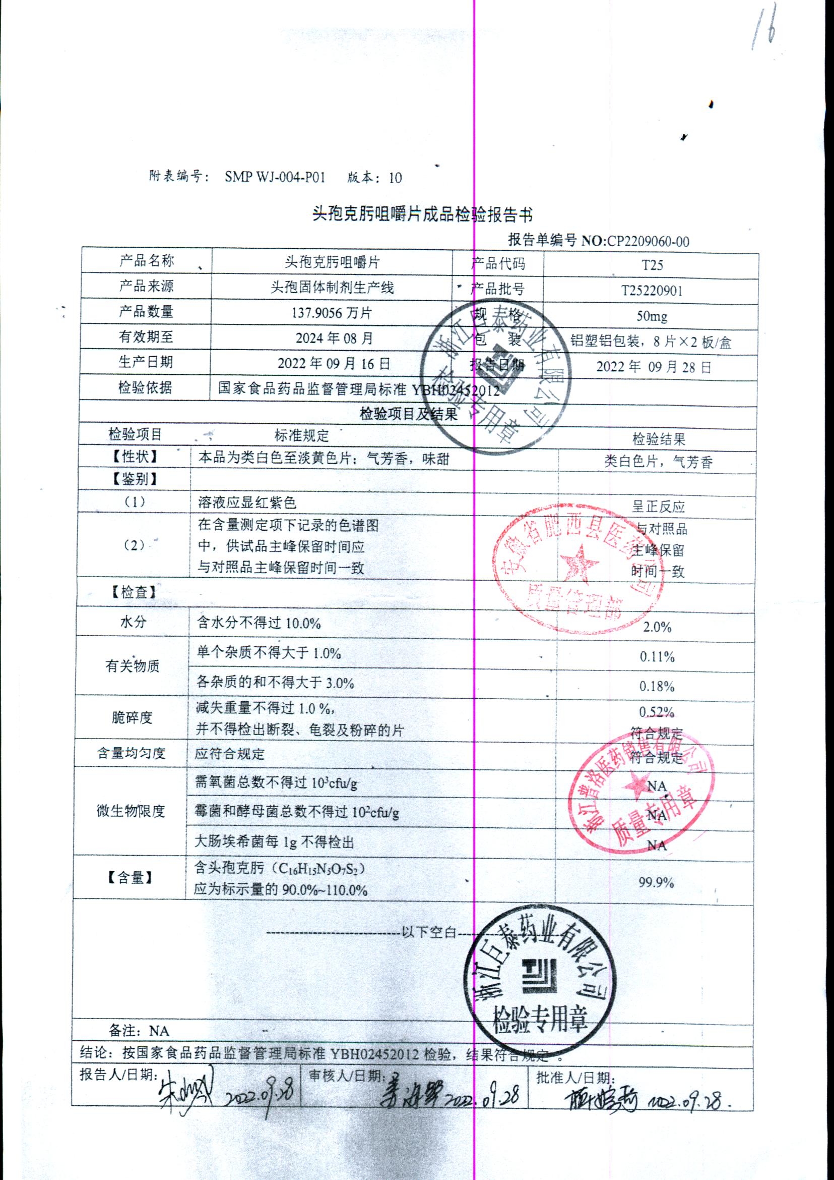 頭孢克肟咀嚼片 | 50mg*16s | T25190607 | 查看詳情 |