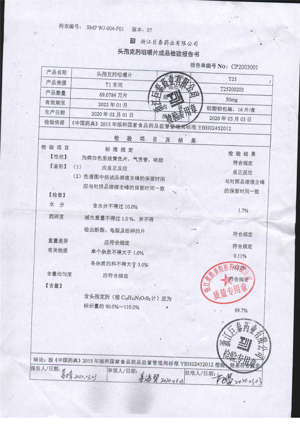 頭孢克肟咀嚼片 | 50mg*16s | T25200205 | 查看詳情 |