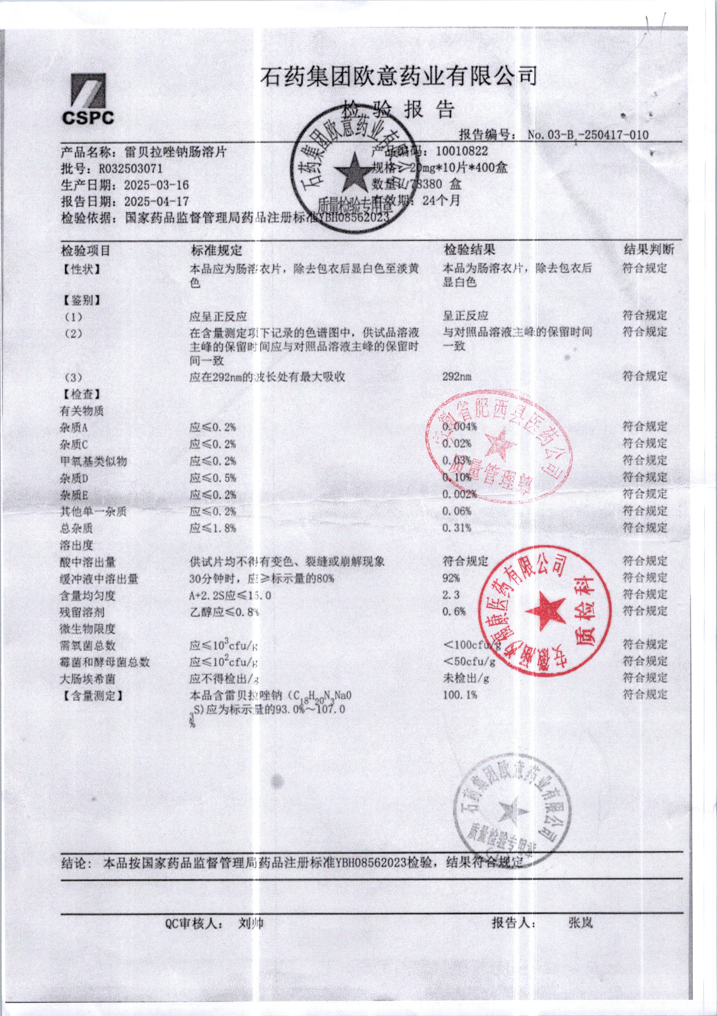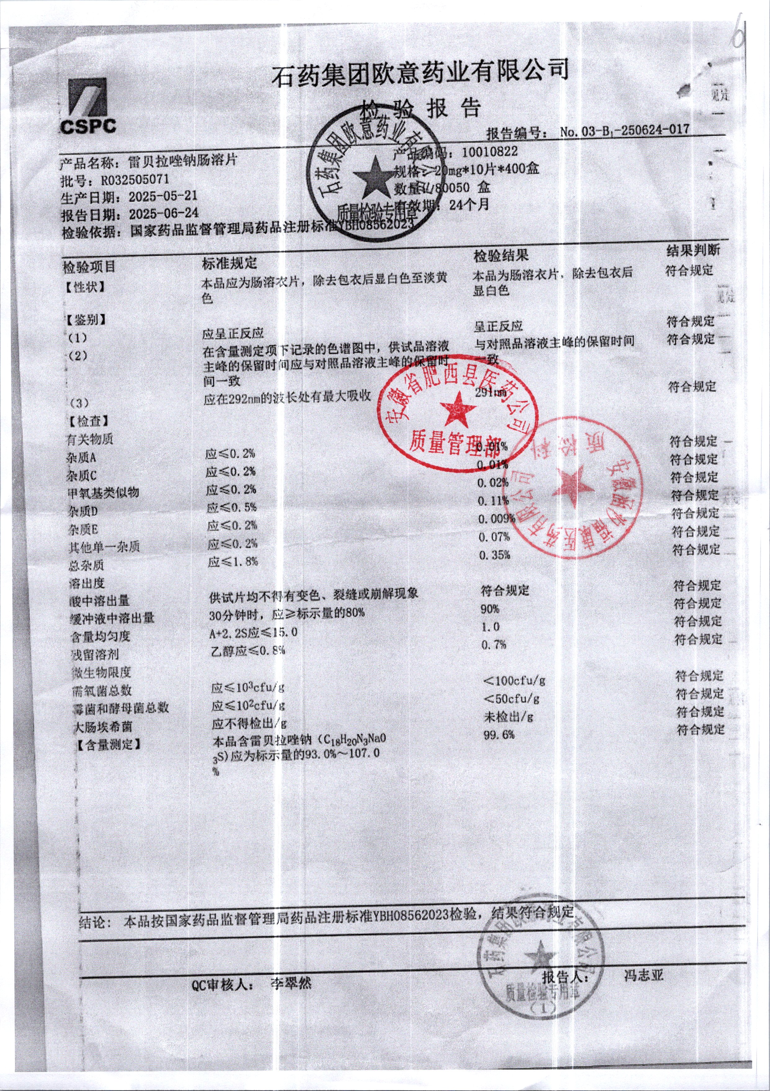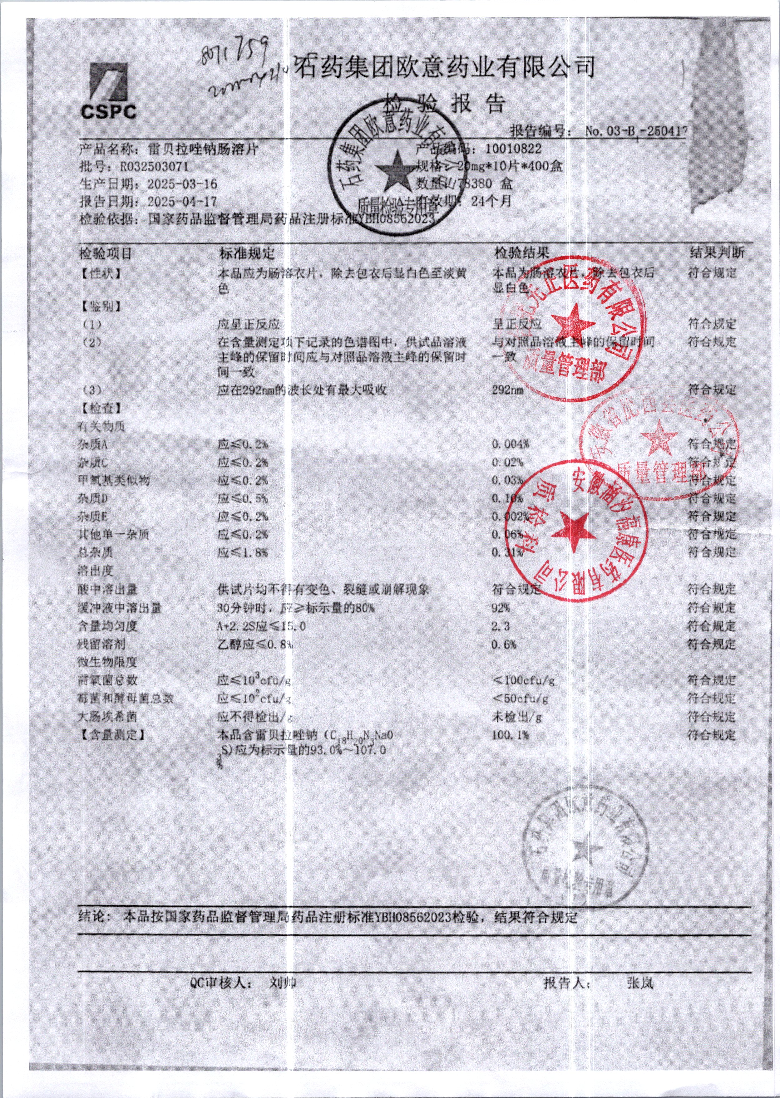 名稱 規(guī)格 批號 藥檢報告