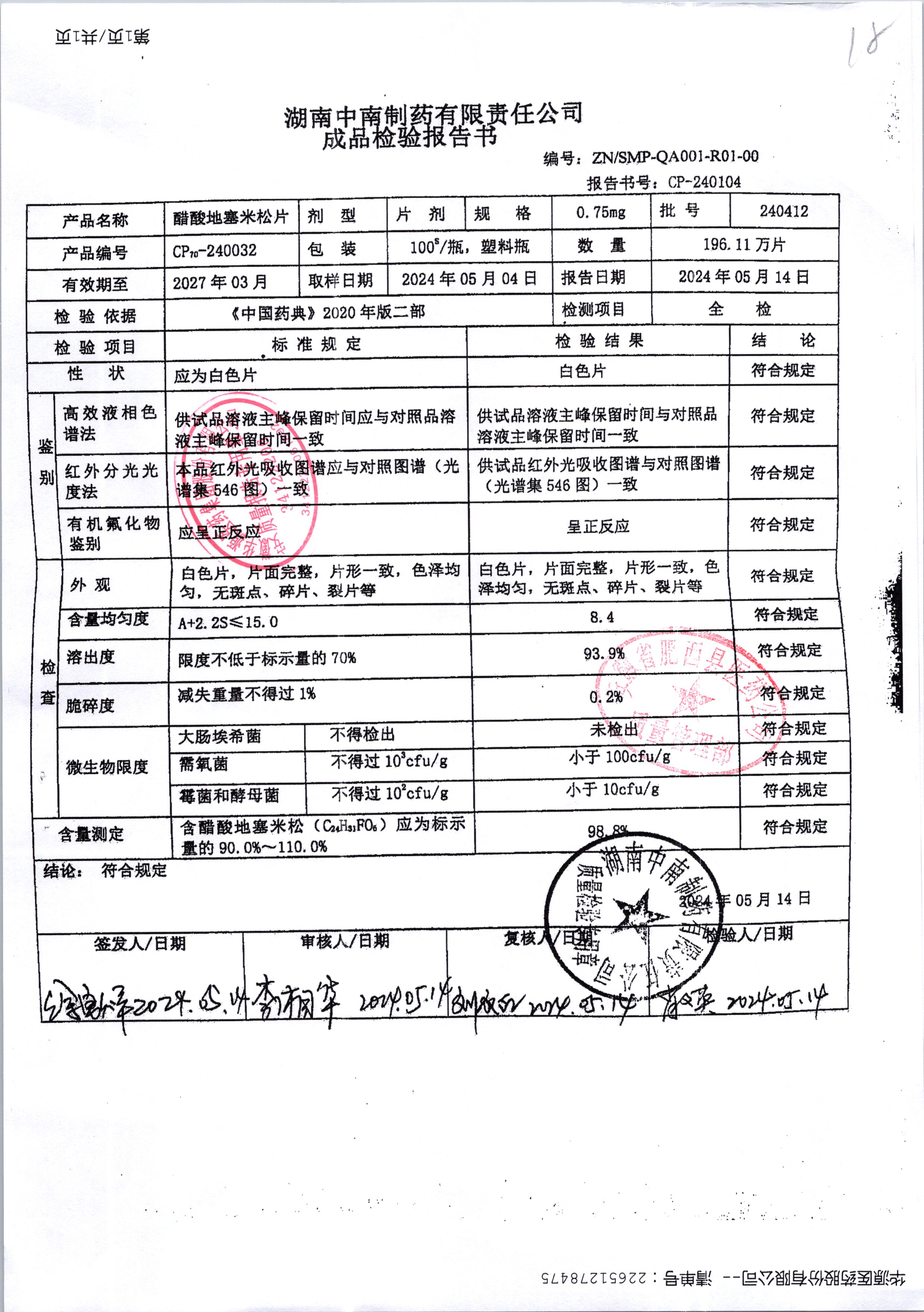 醋酸地塞米松片 0.75g 240412 查看詳情
