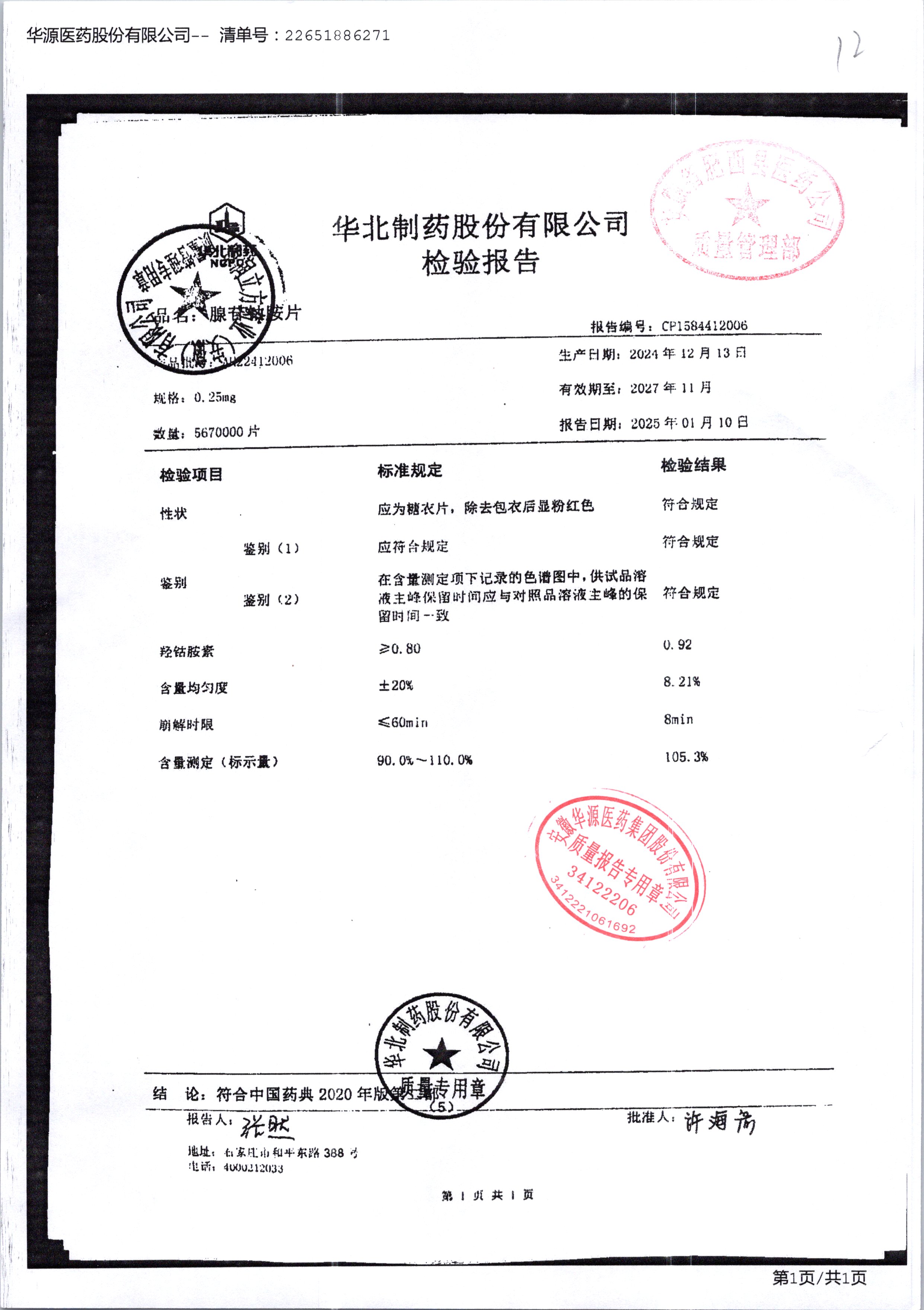 名稱 規(guī)格 批號(hào) 藥檢報(bào)告