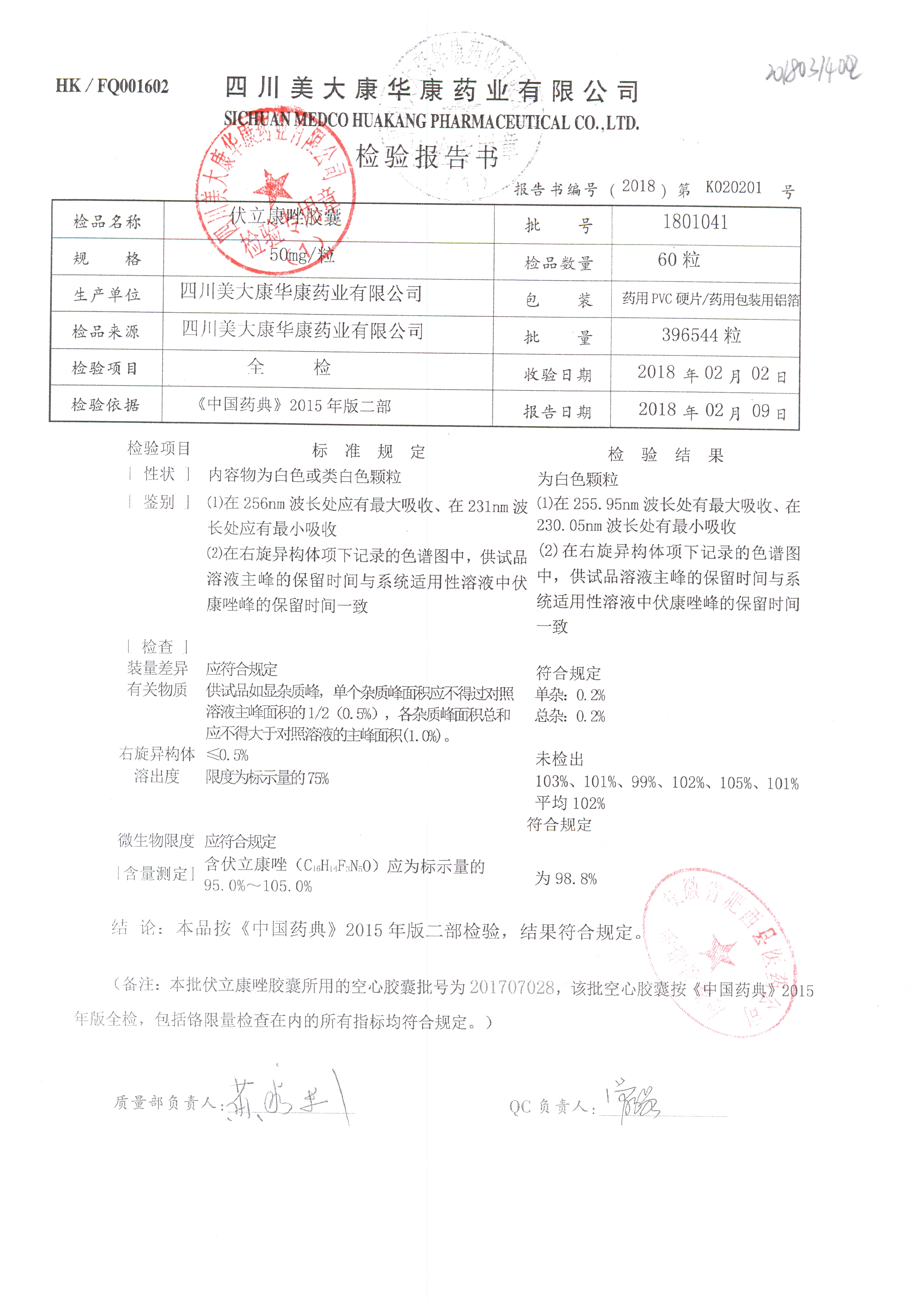 | 伏立康唑膠囊 | 50mg | 1801041 | 查看詳情 |